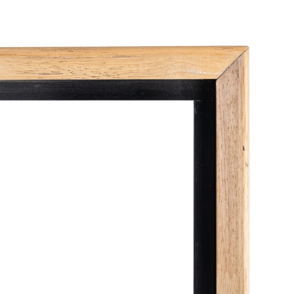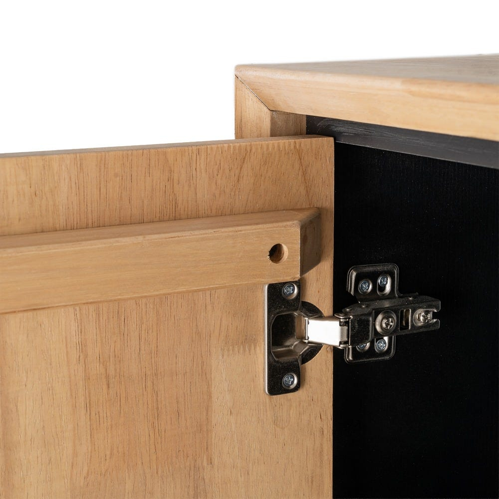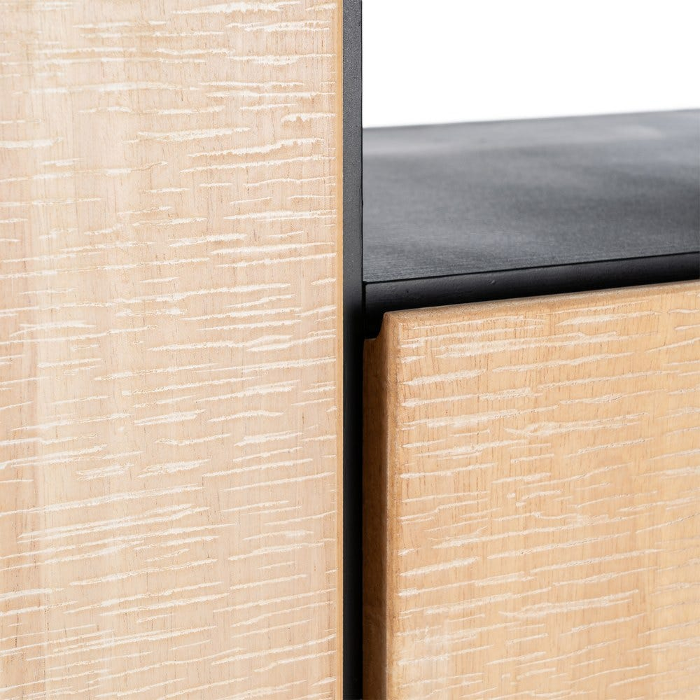 Suprafețele din lemn natur sunt completate de accentele negre care adaugă profunzime și contrast. Datorită compartimentării variate, dulapul permite o organizare practică a obiectelor, de la documente și cărți până la accesorii decorative sau textile.