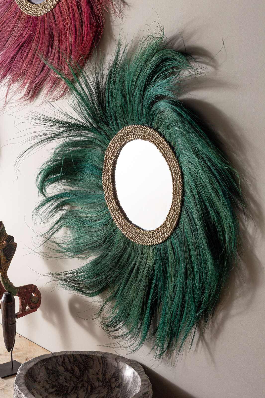 Această oglindă, o creație artizanală în stil etnic, prezintă o nuanță vibrantă de verde într-un design rotund și natural. Realizată din fibră naturală și oglindă, această piesă decorativă spaniolă aduce o notă de prospețime și autenticitate în orice interior. Cu dimensiuni generoase de 100 cm lățime, 2 cm adâncime și 100 cm înălțime, și o greutate de 1,2 kg, oglinda oferă o prezență impunătoare și funcțională. Fibra naturală conferă o textură unică și o conexiune puternică cu natura. Fiind un produs realizat manual, fiecare oglindă este unică, cu variații subtile care îi sporesc valoarea artistică și autenticitatea.