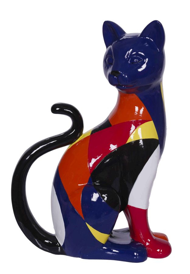 Statuetă pisică stilizată în stil rubic multicolor. Decor artistic inovator, fuzionează arta contemporană cu elemente jucăușe. Piesă statement pentru interioare eclectice. Produs din colecția de toamnă 2024!