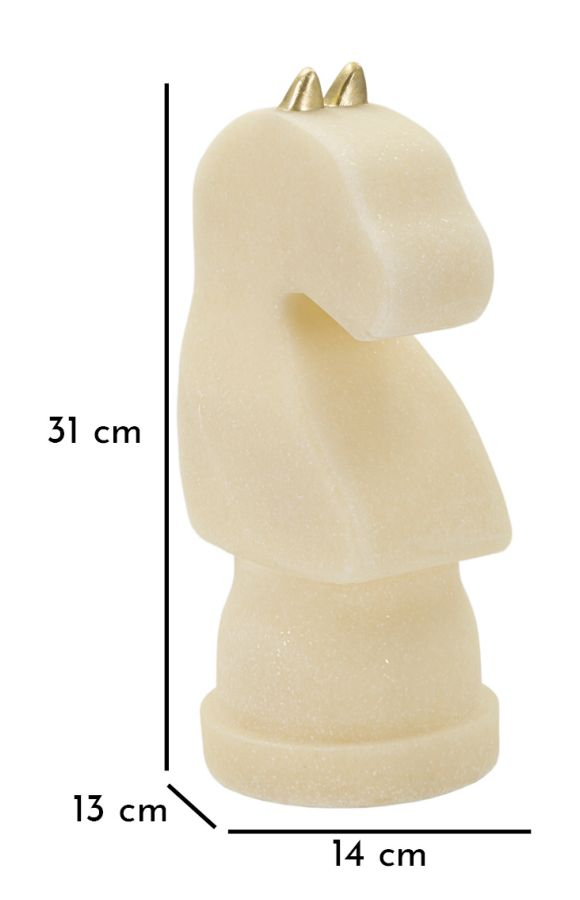 O statuetă pentru iubitorii șahului. Statuetă cal alb șah realizată din quartz alb cu un fin accent auriu. Liniile designului sunt simple, curate. Potrivit ca statuetă în decor minimalist. Parte din colecția Mauro Ferretti și adusă în România de CreativDeco, piesa reprezintă o interpretare modernă și rafinată a piesei de șah clasice. Poate fi amplasată pe o etajeră într-un birou, pe o consolă în living sau într-o bibliotecă. Cu o greutate de 2,4 kg și dimensiuni de 14x13x31 cm, această statuetă cal alb de șah este o piesă de decor versatilă.