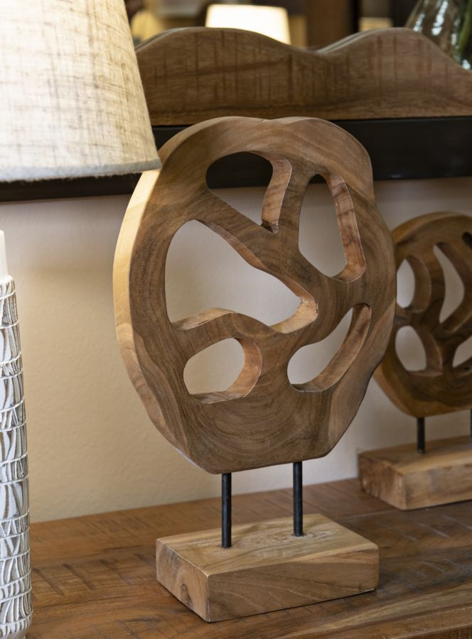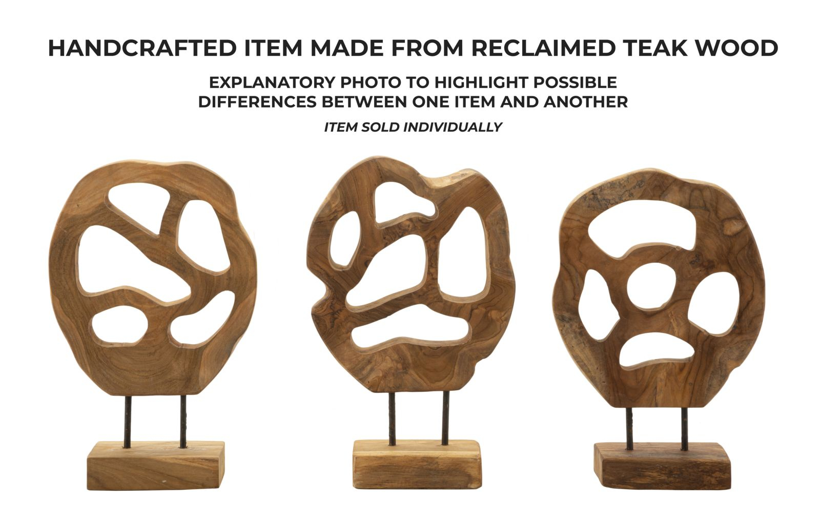 Formele organice, decupajele fluide și fibra lemnului vizibilă transformă această sculptură într-un obiect cu prezență artistică puternică. Lucrată manual din tec reciclat, piesa păstrează nuanțe și nervuri naturale, iar jocul gol–plin conferă dinamism și caracter contemporan.