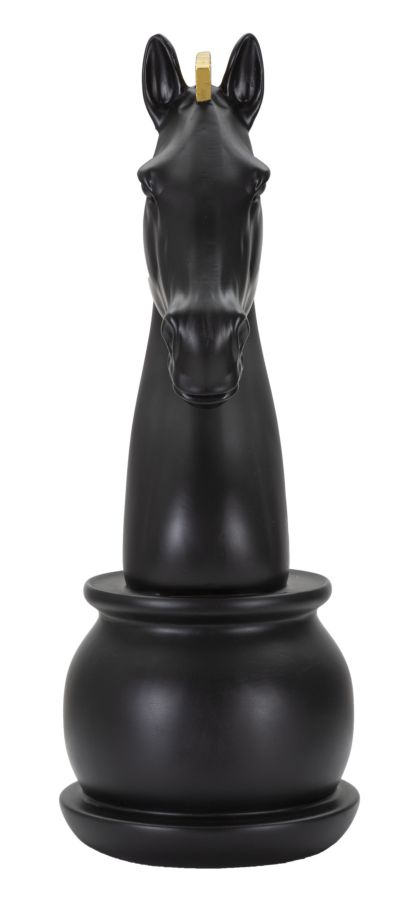 Statuetă decorativă piesă de șah reprezentând calul negru realizată cu minuțiozitate din rășină neagră și cu un ușor accent auriu. Poate fi considerată o statuetă decorativă înaltă, cu cei 50 de cm înălțime poate fi așezată și pe podea