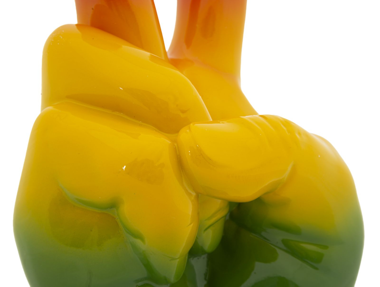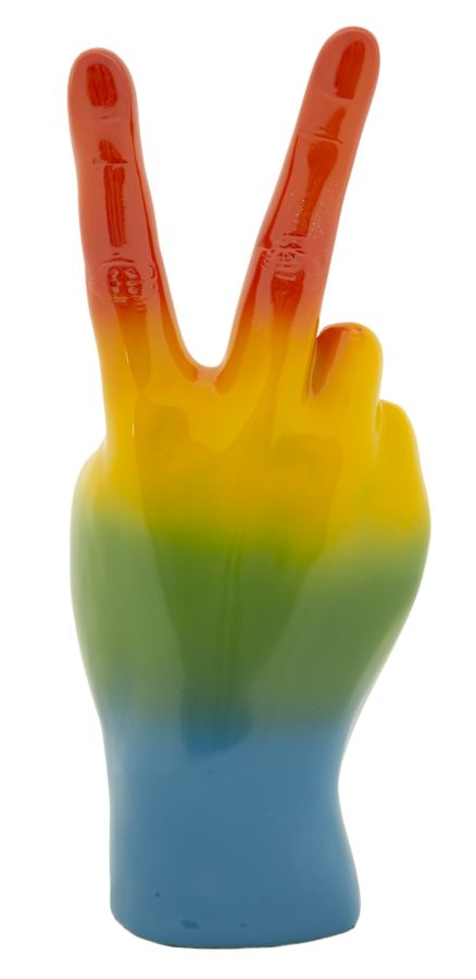 Această statuetă decorativă înfățișează o mână stilizată în semnul victoriei, realizată din rășină rezistentă și colorată în nuanțe vibrante de curcubeu. Designul său modern transmite un mesaj puternic de libertate, energie și pozitivitate.