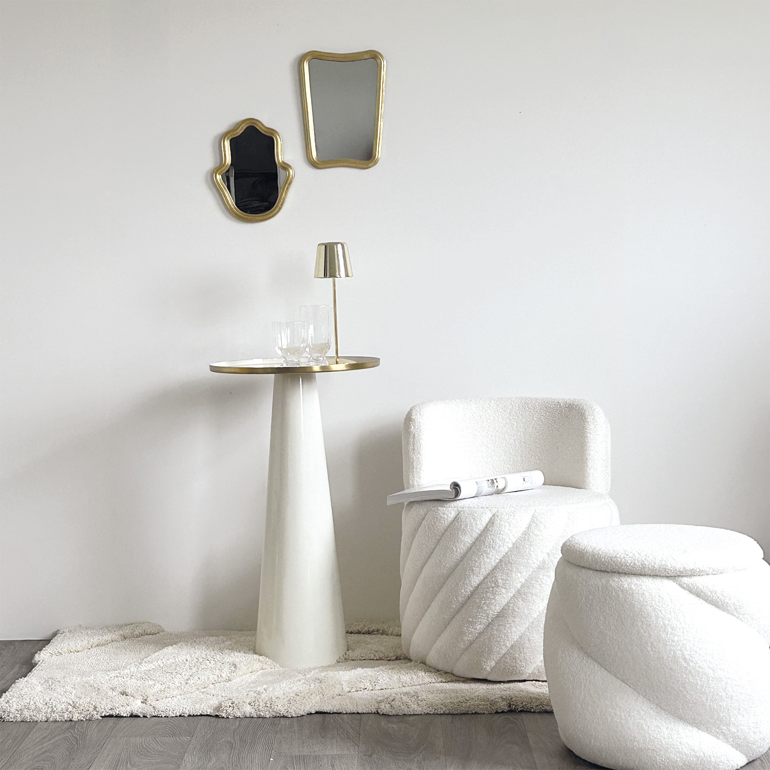 Produsul este o creatie originala franceza de la Opjet Paris pentru living modern. Fotoliu compact pivotant tapitat in material teddy 100% poliester in nuanta alba. Design special pentru stilul slowlife cu spatar si sezut confortabil din spuma poliuretanica densitate 28 kg/m³. Structura din MDF. Nu necesita montaj. Dimensiuni: latime 52 cm adancime 52 cm inaltime 62 cm inaltime sezut 42 cm. Greutate: 8.1 kg.