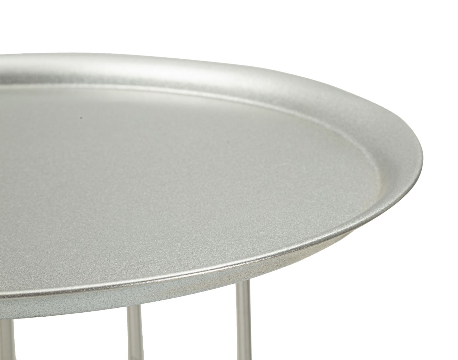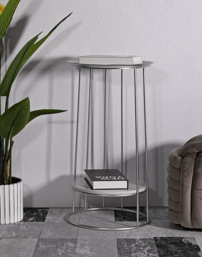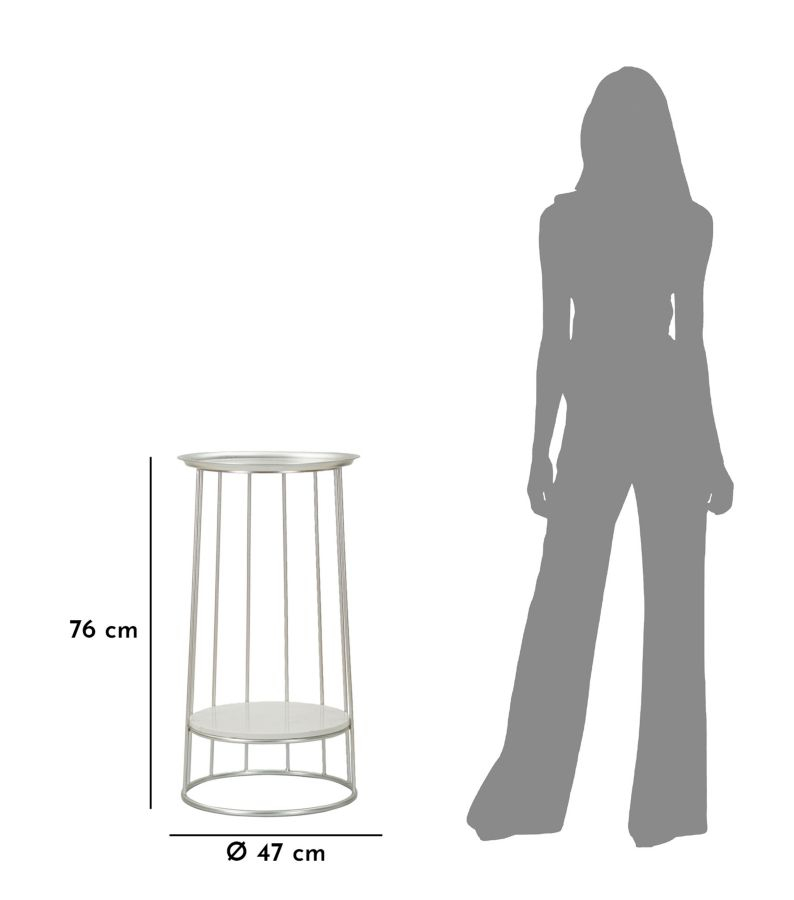 Măsuță laterală înaltă argintie cu raft de marmură și blat metalic tip tavă, o piesă deosebită pentru spații moderne. Structura metalică se remarcă prin modelul geometric cu linii paralele, în timp ce raftul din marmură oferă un spațiu elegant pentru depozitare sau expunerea obiectelor decorative. Blatul superior, cu margini ridicate în stil tavă, adaugă funcționalitate și stil. Perfectă pentru a fi plasată lângă canapea în living sau într-un colț al dormitorului. Acest produs este creat de Mauro Ferretti și importat de CreativDeco, reprezentând excelența în design și calitate italiană. Măsuța, realizată din metal și marmură, are dimensiunile de 40x76 cm și cântărește 5,9 kg.