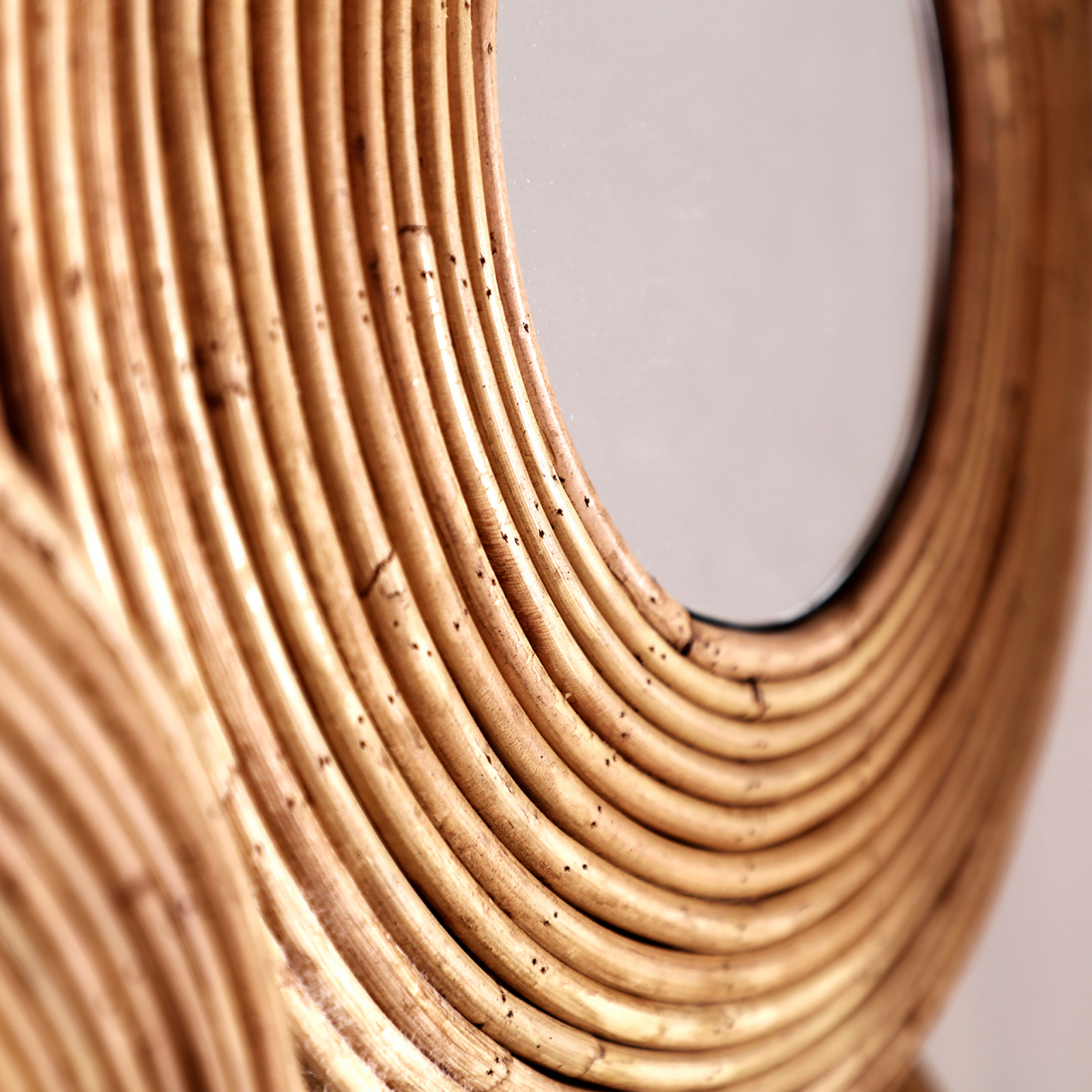 Oglinda cu forma organica si rama din bambus natural. Design Boho autentic pentru un decor personalizat