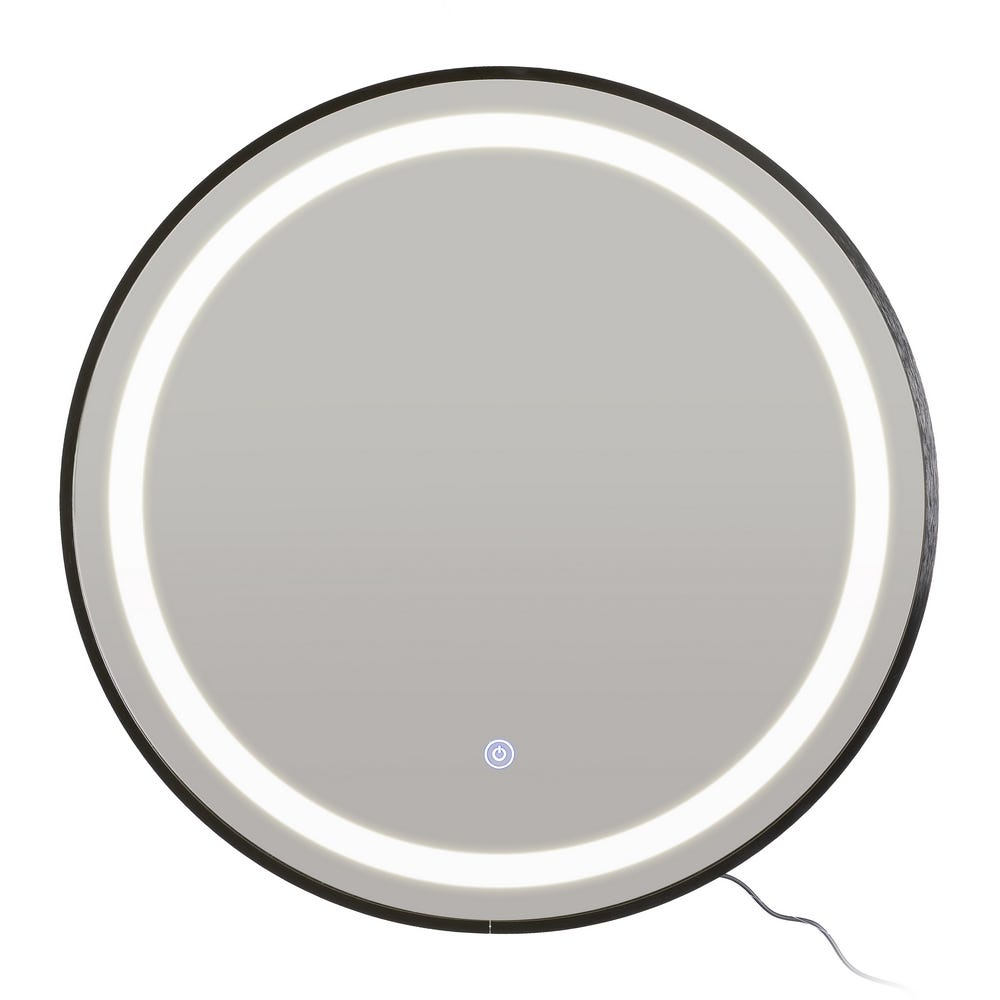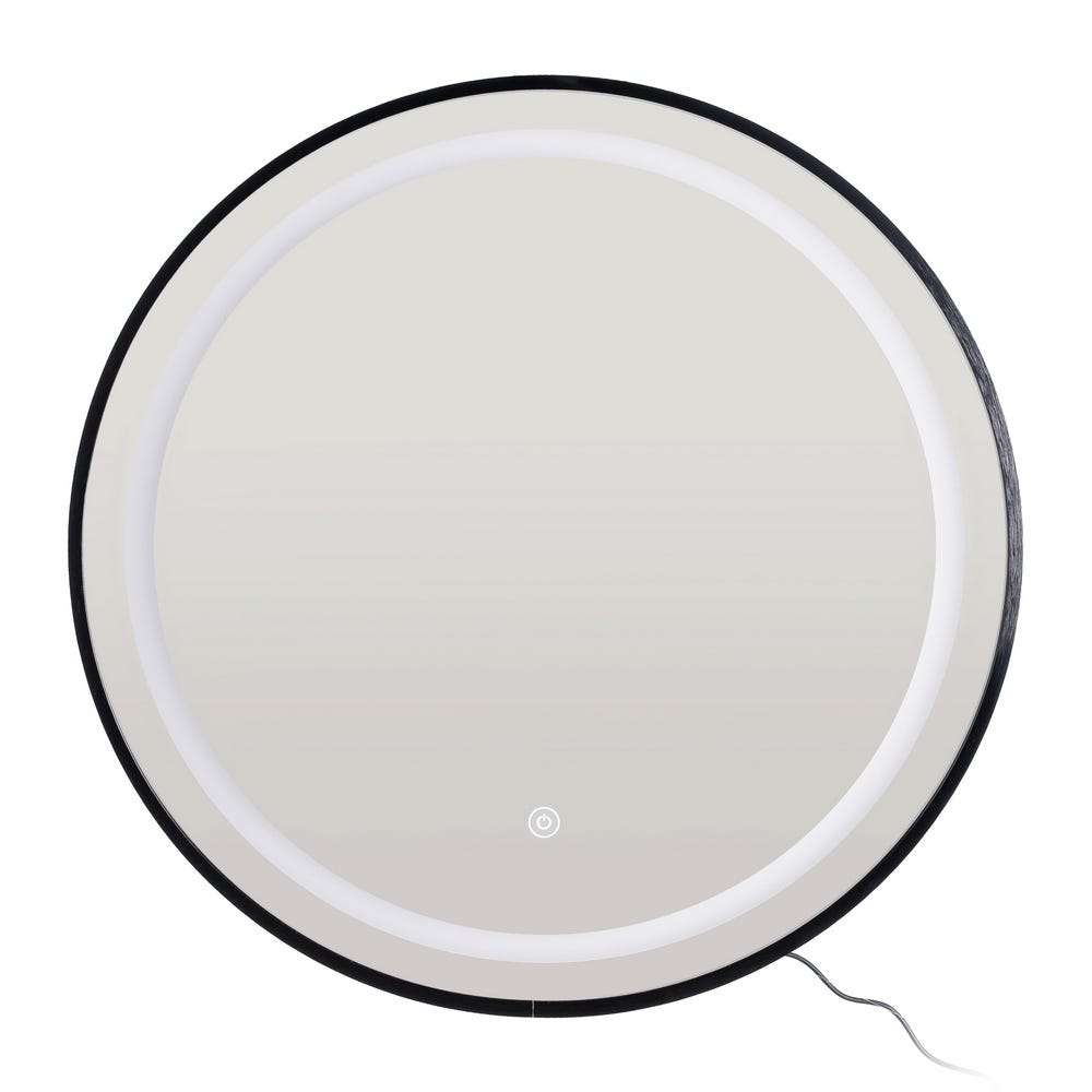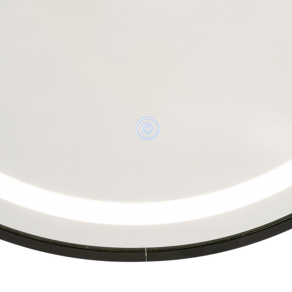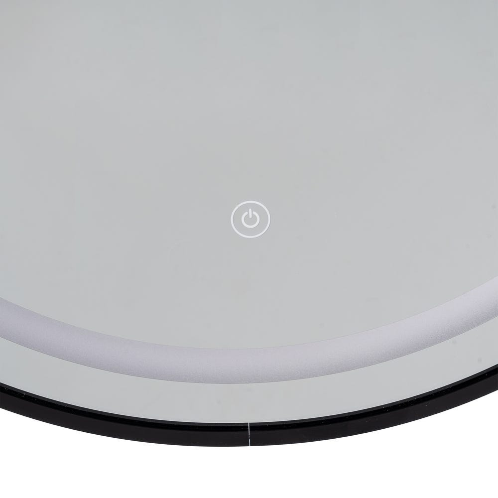 Oglindă rotundă cu iluminare LED integrată, ramă din aluminiu de culoare neagră și funcție de control tactil on/off.