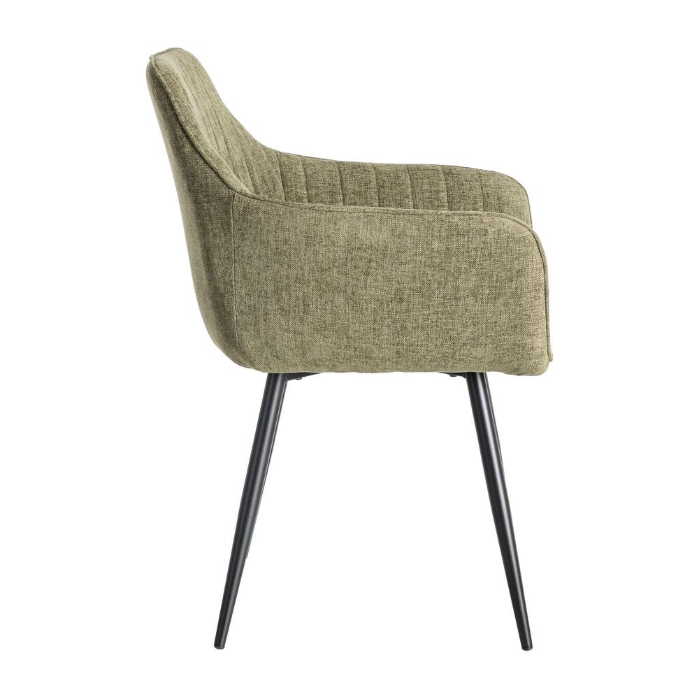 Scaunele se remarcă prin designul cu linii verticale pe tapițerie și forma ergonomică a spătarului și brațelor. Nuanța verde adaugă un accent sofisticat și natural, perfect pentru spații contemporane sau elegante.