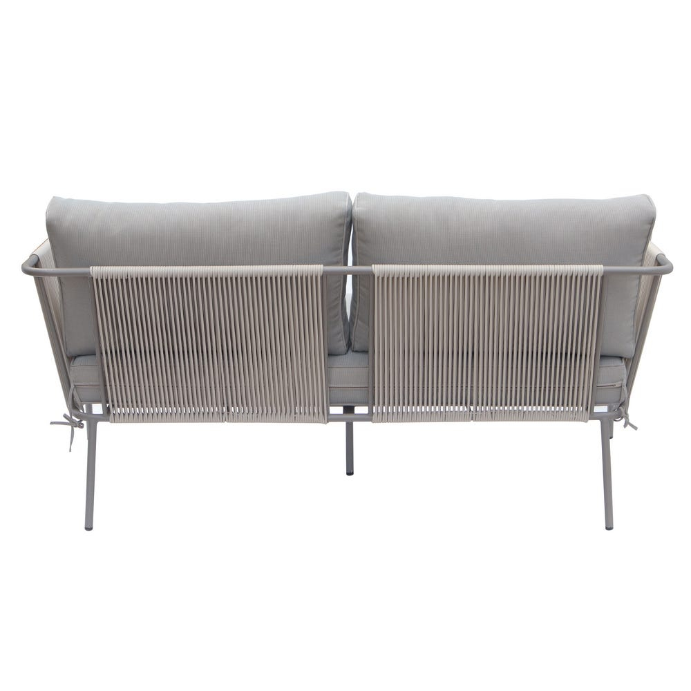 Cadrul metalic negru, subțire dar robust, creează o structură stabilă și aerisită. Spătarele și lateralele sunt decorate cu frânghie textilă, tensionată uniform – un detaliu grafic care adaugă personalitate pieselor fără să încarce vizual spațiul. Finisajul mat al metalului contrastează subtil cu textura moale a pernelor.