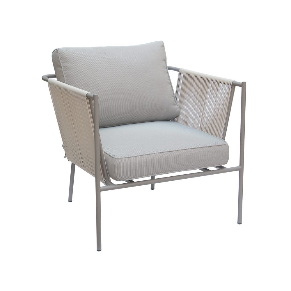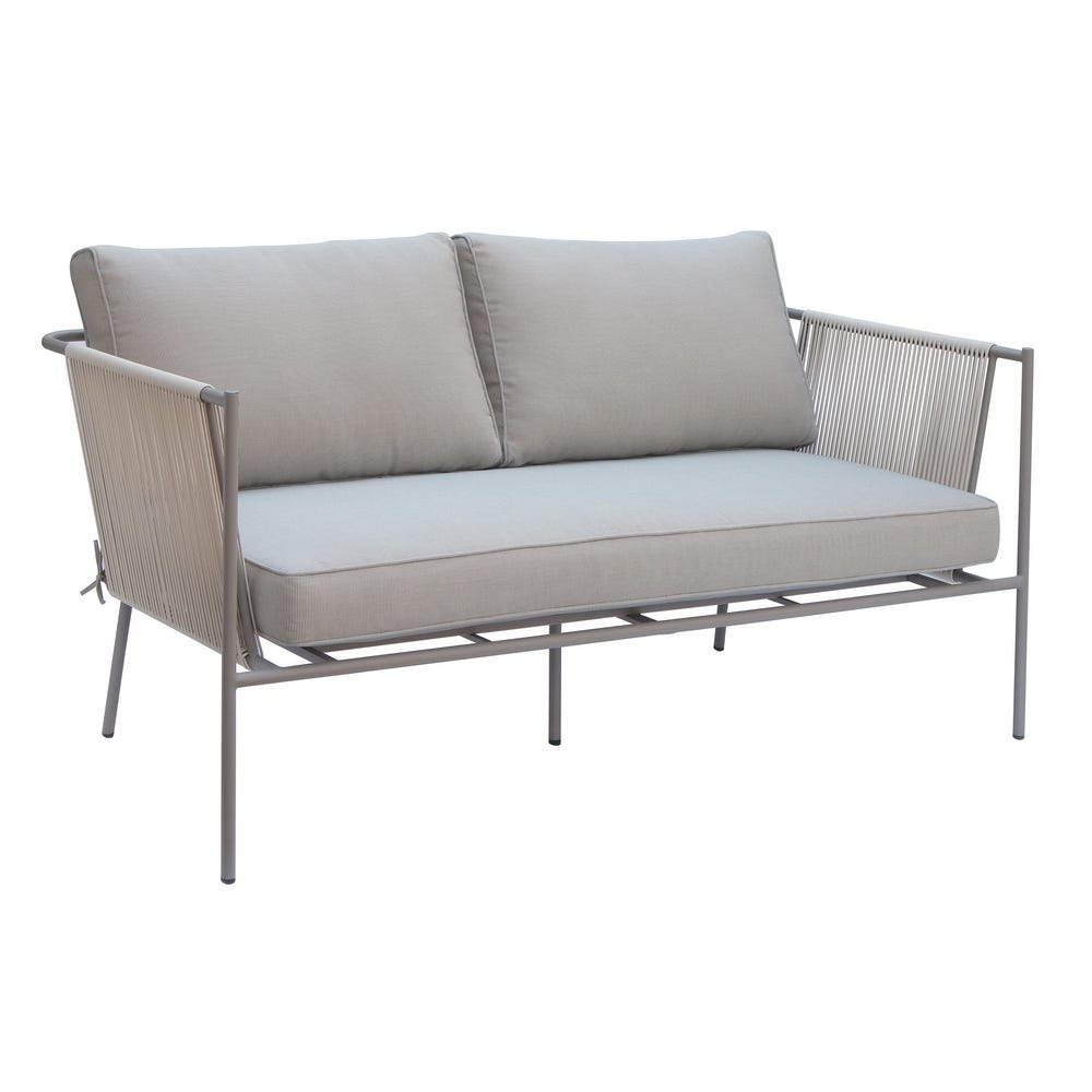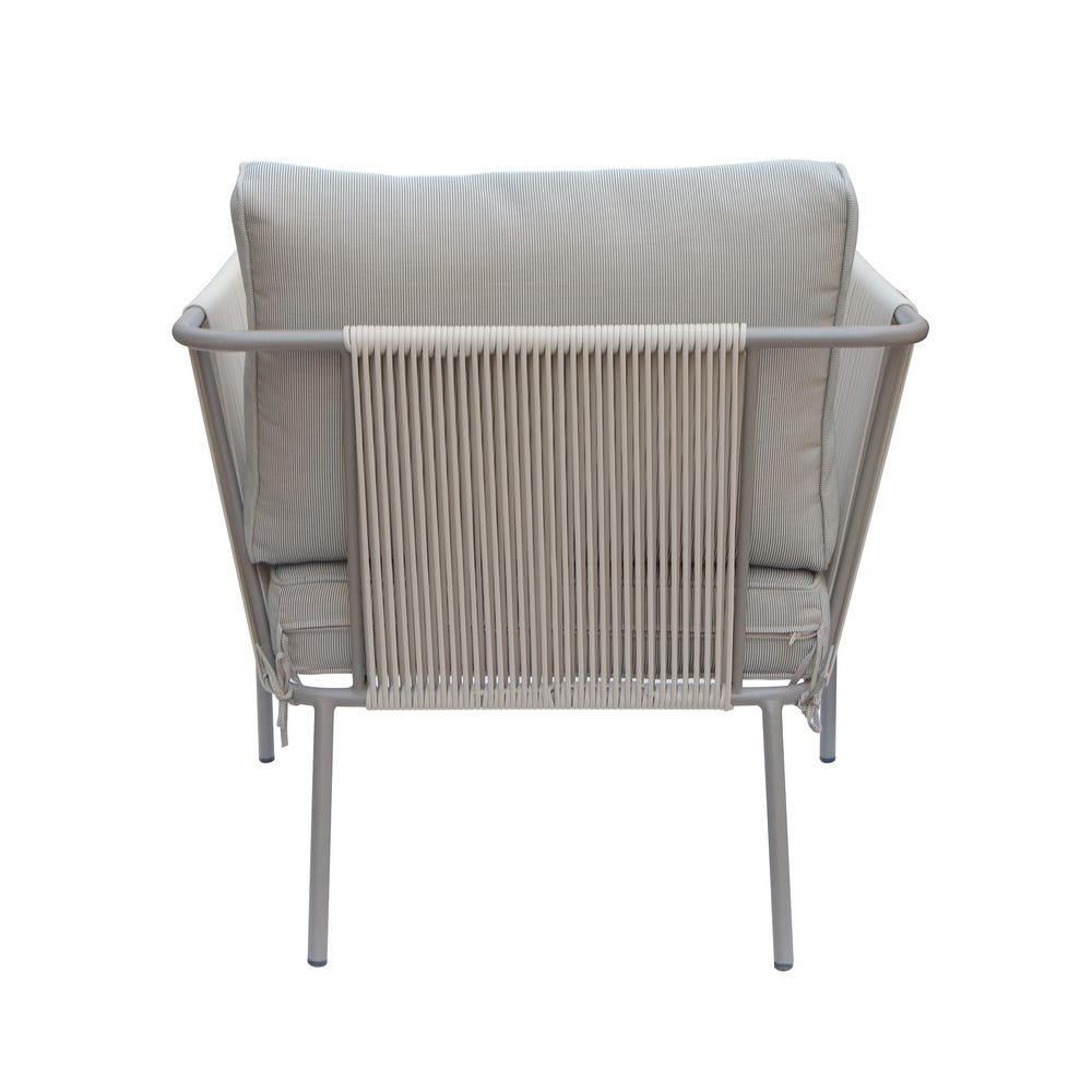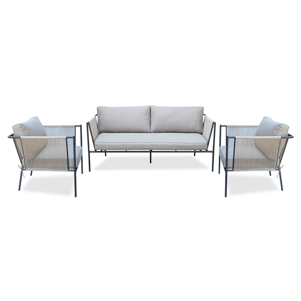 Canapeaua și fotoliile sunt echipate cu perne moi și rezistente, tapițate cu material textil special pentru exterior. Culoarea neutră oferă versatilitate estetică și se potrivește perfect cu designul industrial-elegant al cadrului negru. Sunt ușor de întreținut și destinate utilizării zilnice – de la cafeaua de dimineață la serile de vară petrecute afară.