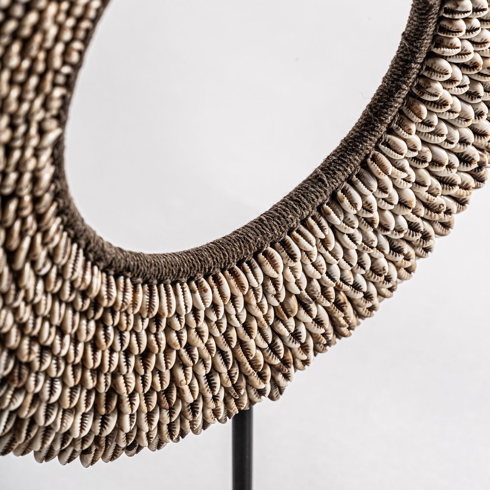 Statuetă etnică din fier și scoici, cu design vertical și expresiv. Aduce un aer autentic și primitiv în orice interior.