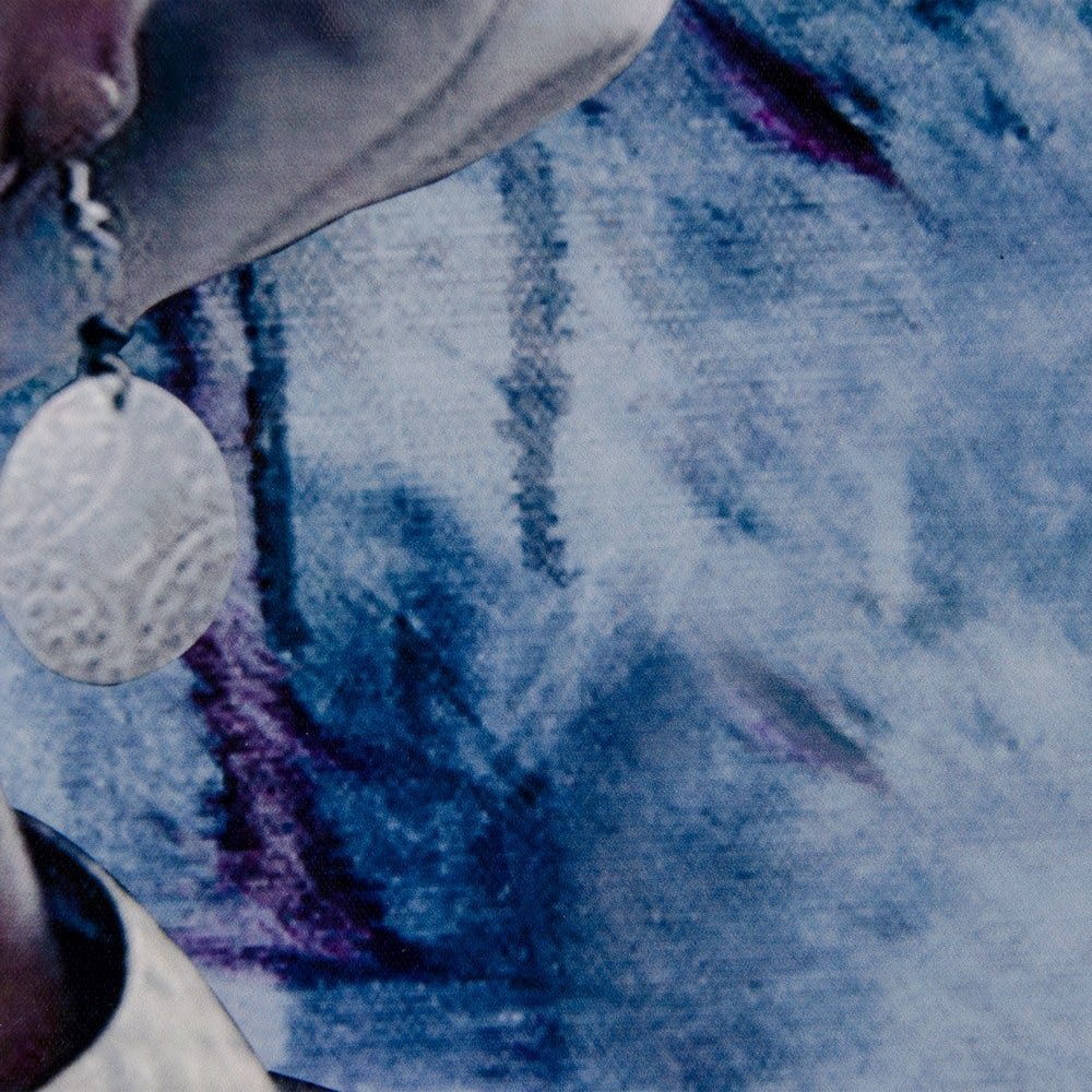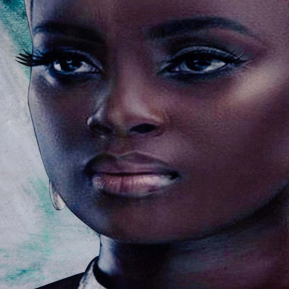 Fundalul pictural, in nuante abstracte de albastru, violet si verde, contrasteaza armonios cu tonurile pielii si ale vestimentatiei, subliniind stilul etnic modern al compozitiei. Este un tablou ideal pentru interioare sofisticate, cu accente artistice, dar si pentru decoruri boho-chic, africane reinterpretate sau glam cu influente culturale.