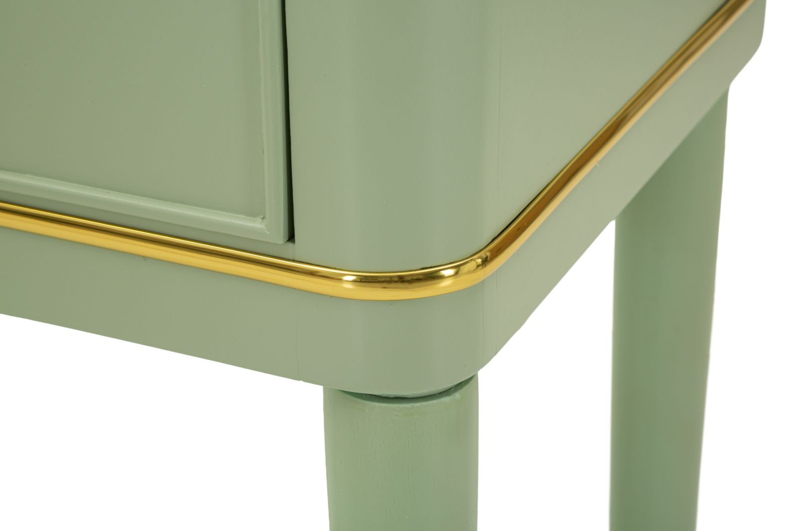 Picioarele subțiri, ușor conice, cu capete aurii, oferă un aer rafinat și elegant, iar combinația dintre verdele salvie și accentele aurii creează acel sentiment discret de lux care transformă dormitorul într-un spațiu confortabil și stilat.
