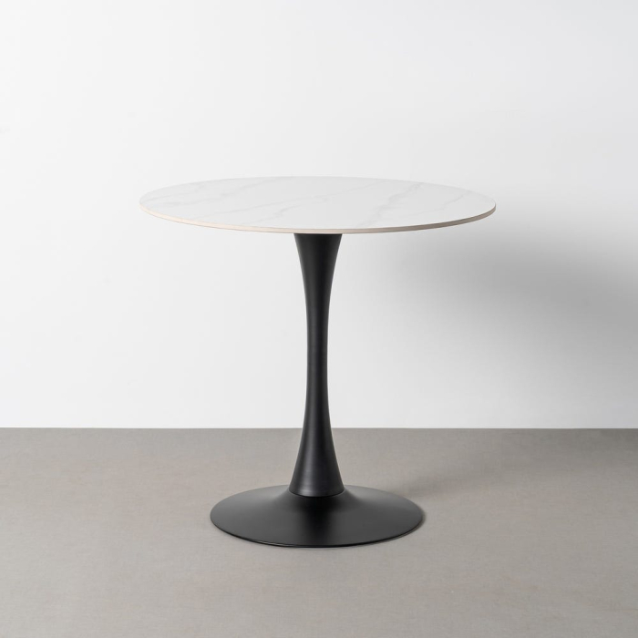 Blatul rotund alb are o grosime de 11 mm și o suprafață netedă cu efect de marmură calacatta, evidențiind venele discrete specifice acestui finisaj. Diametrul de 80 cm oferă proporții echilibrate și utilizare confortabilă în spații rezidențiale sau comerciale.