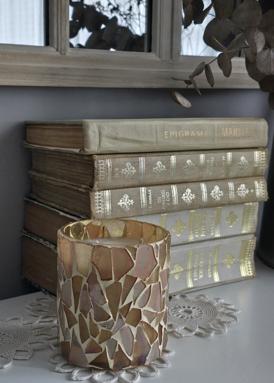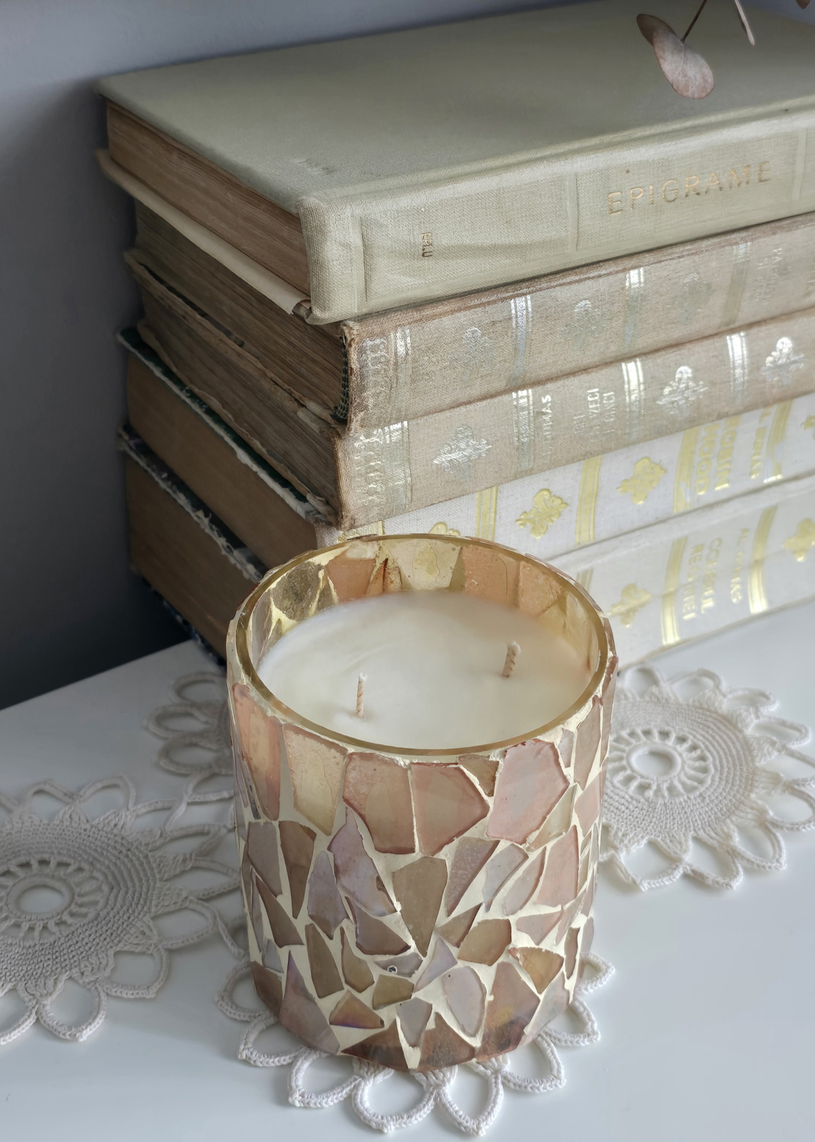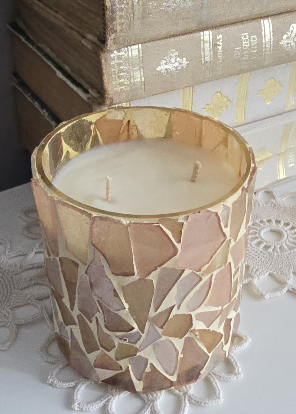 Acest suport de lumânare artizanal din sticlă bej mozaic este conceput ca un obiect decorativ cu impact vizual delicat, potrivit pentru amenajări care pun accent pe lumină caldă și detalii lucrate manual. Bucățile de sticlă reciclată, dispuse într-un joc neregulat de nuanțe bej și sidefii, sunt completate de o lumânare din ceară de soia, creând un ansamblu decorativ echilibrat și plăcut în orice spațiu interior.