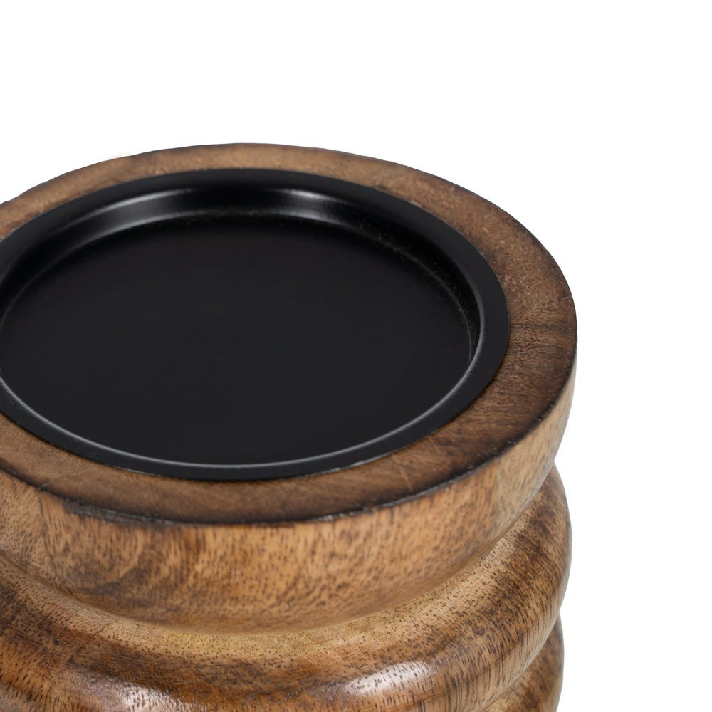 Diferența de înălțime dintre cele două piese creează un aranjament unitar și dinamic, ideal pentru lumânări decorative sau pentru completarea unui colț de ambient. Nuanța naturală a lemnului de mango se combină ușor cu sticlă, ceramică, textile în tonuri neutre și accesorii în nuanțe pământii.