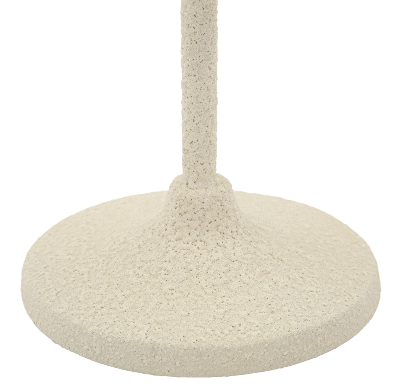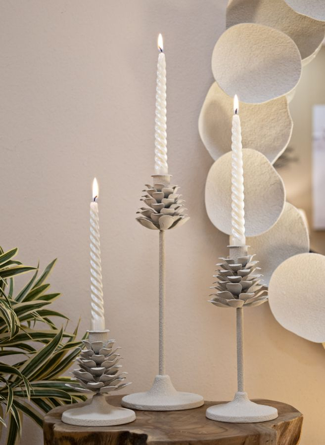 Baza solidă și structura înaltă oferă stabilitate, în timp ce detaliile stratificate ale suportului pentru lumânare amintesc de petalele lemnoase ale unui con de pin. Finisajul bej cu textură mată completează aspectul natural, făcându-l ușor de integrat în decoruri scandinave, rustice sau eco-chic.