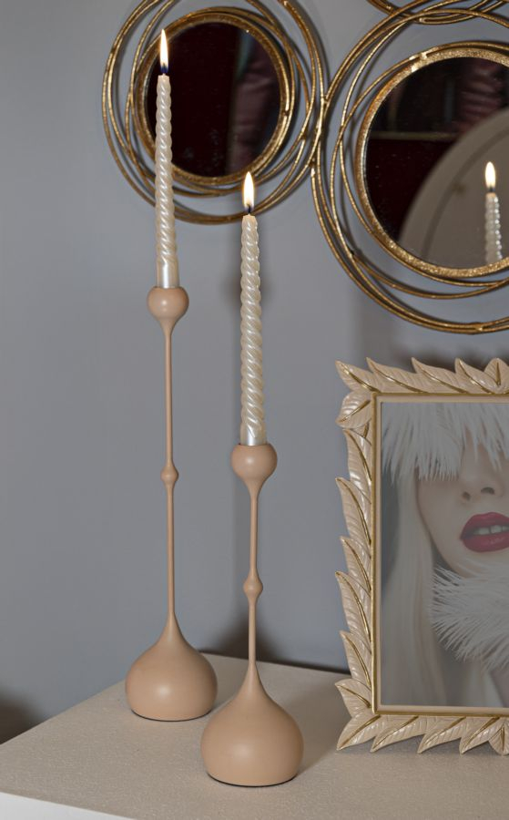 Aceste sfeșnice se remarcă prin liniile delicate și forma alungită, oferind un aspect minimalist, dar sofisticat. Finisajul roz pudrat adaugă un plus de eleganță și căldură, fiind ușor de asortat atât în decoruri moderne, cât și în spații cu influențe romantice sau scandinave.