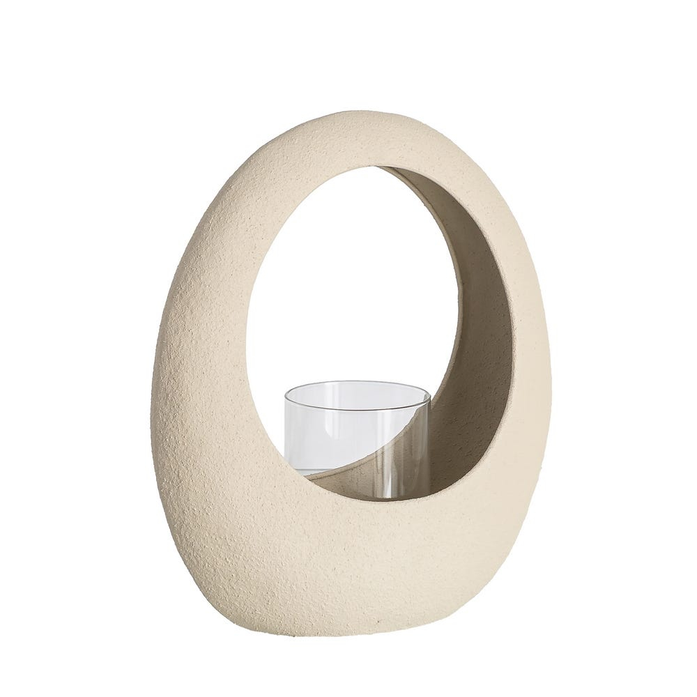 Acest suport decorativ pentru lumânare impresionează prin designul său sculptural cu formă ovală deschisă, care creează un joc elegant de volume și goluri. Structura din metal cu finisaj mat bej este completată de un cilindru interior din sticlă, destinat lumânării, oferind un contrast subtil și rafinat.