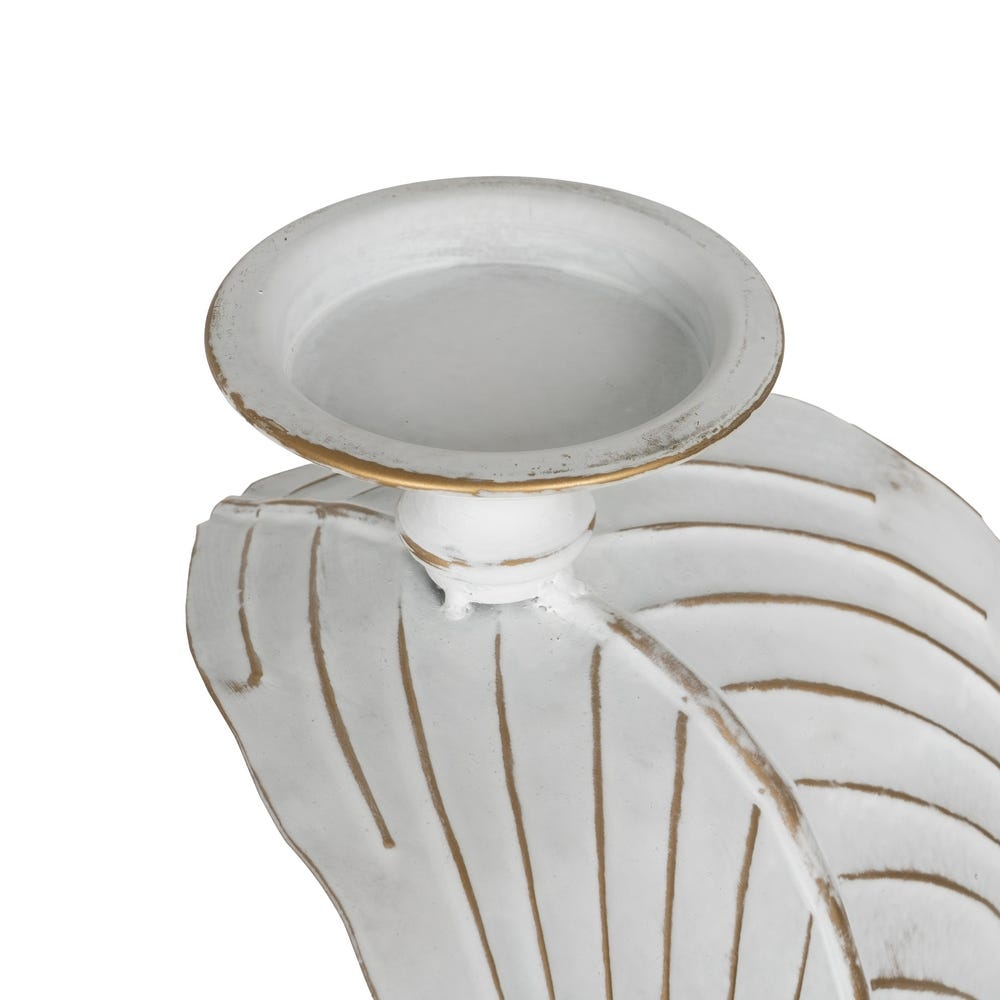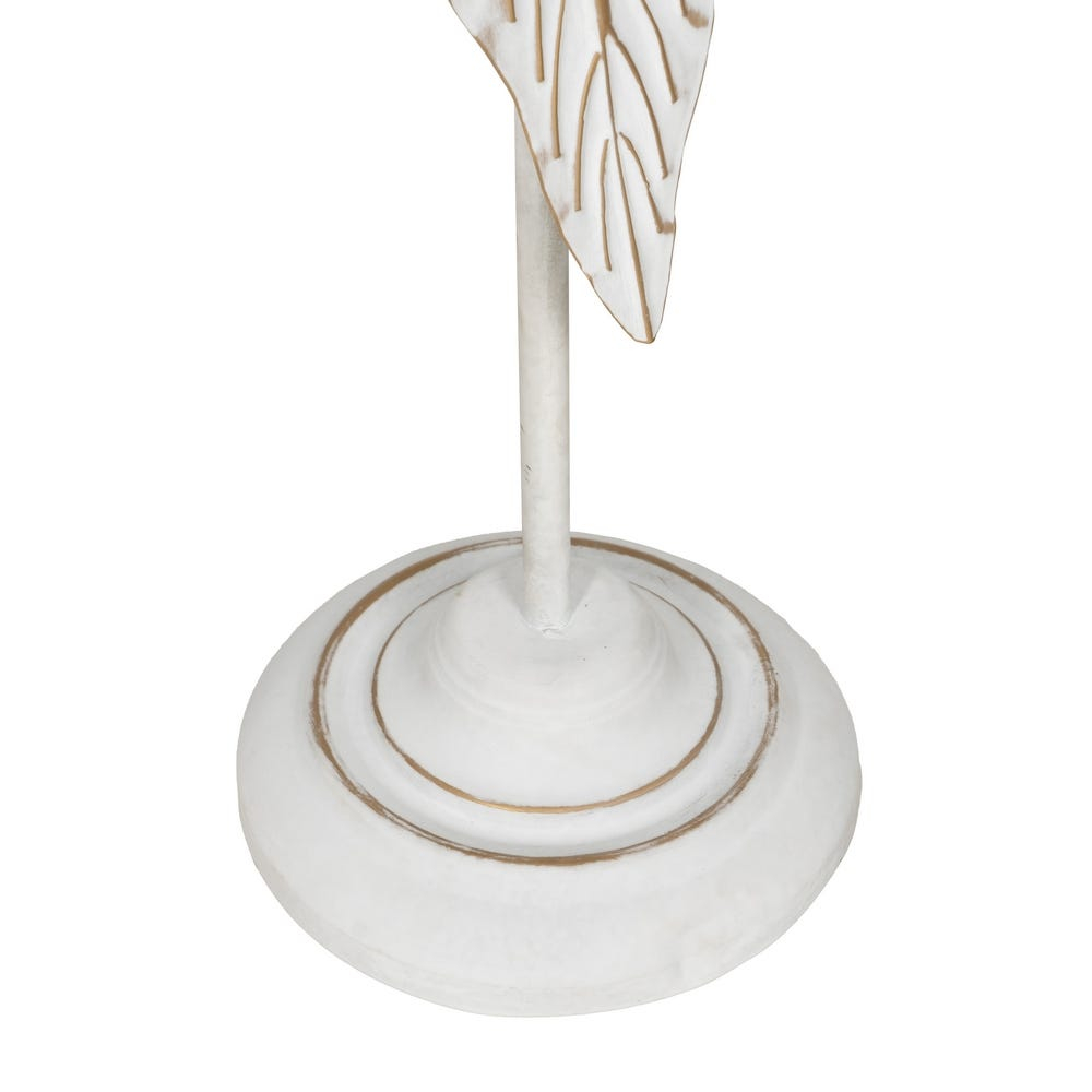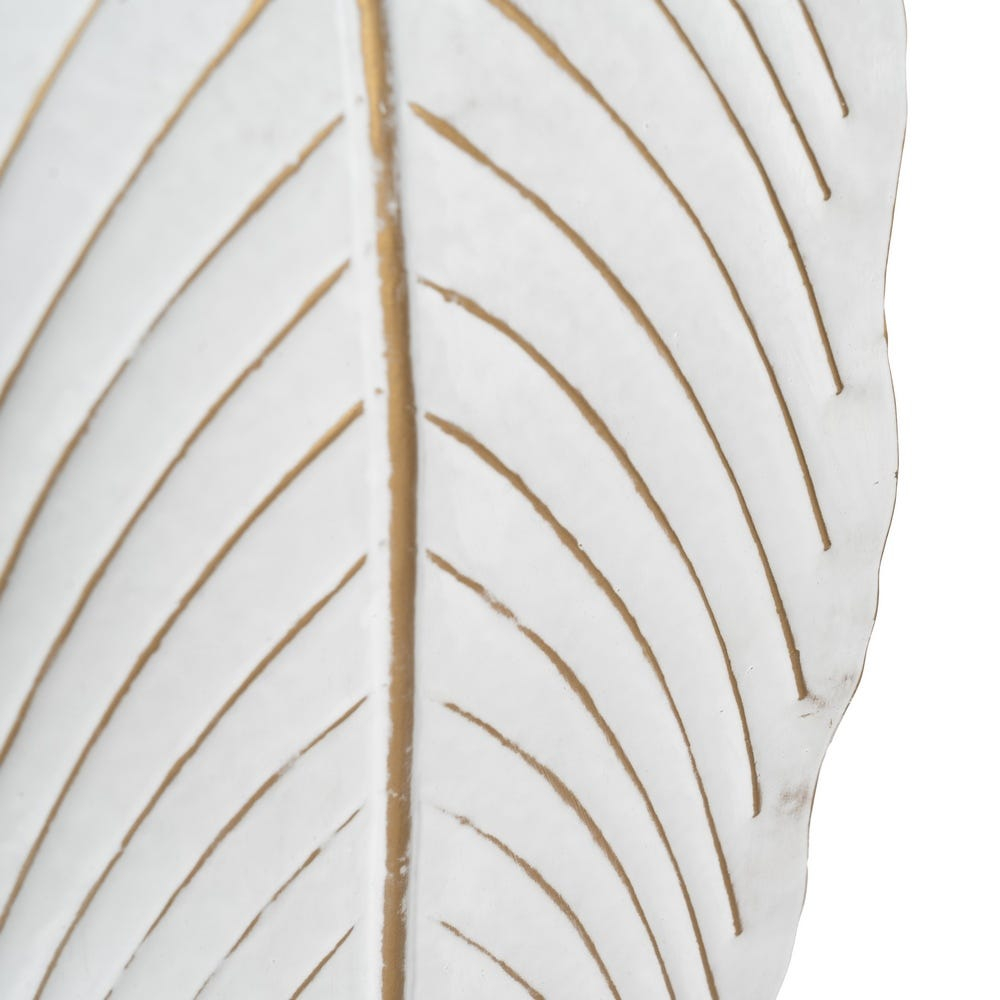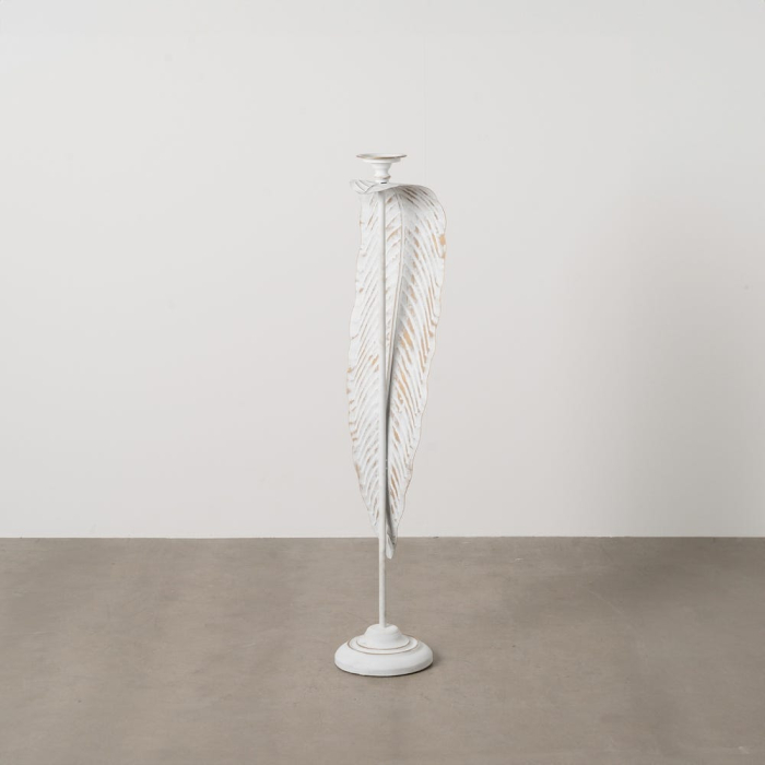 Designul pornește de la o bază rotundă stabilă și se dezvoltă pe verticală printr-o tijă subțire, care susține elementul central: o frunză alungită, sculptată, cu linii fine și textură vizibilă. Finisajul alb, cu accente ușor patinate, evidențiază detaliile frunzei și oferă piesei un aer elegant, cu influențe naturale, potrivit pentru decoruri luminoase.