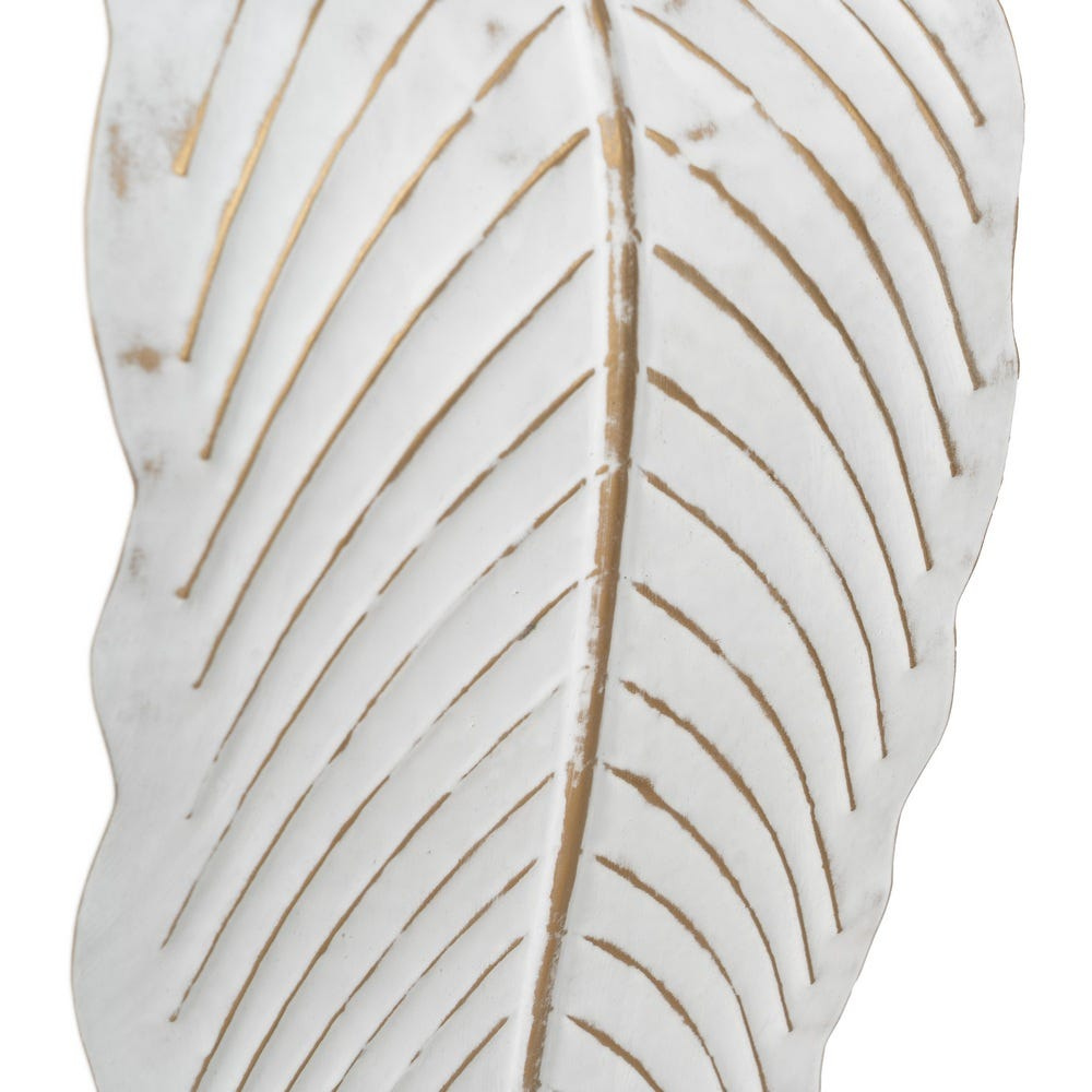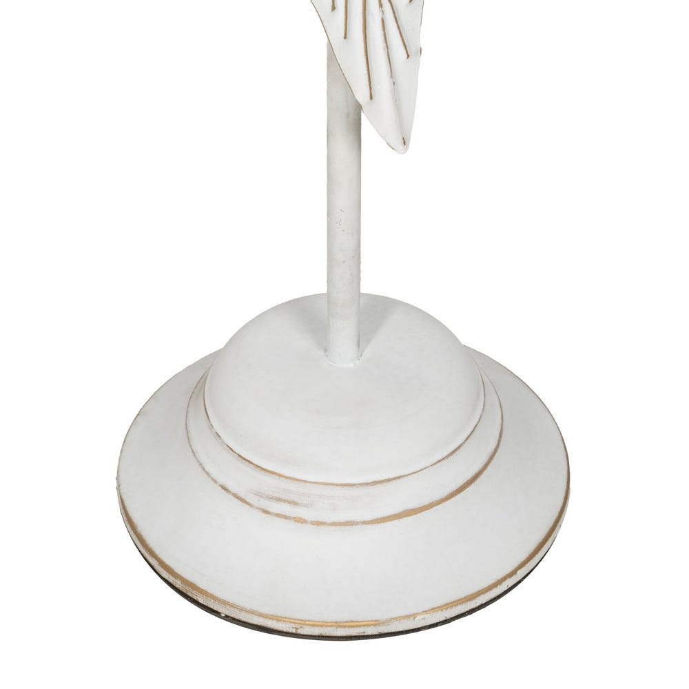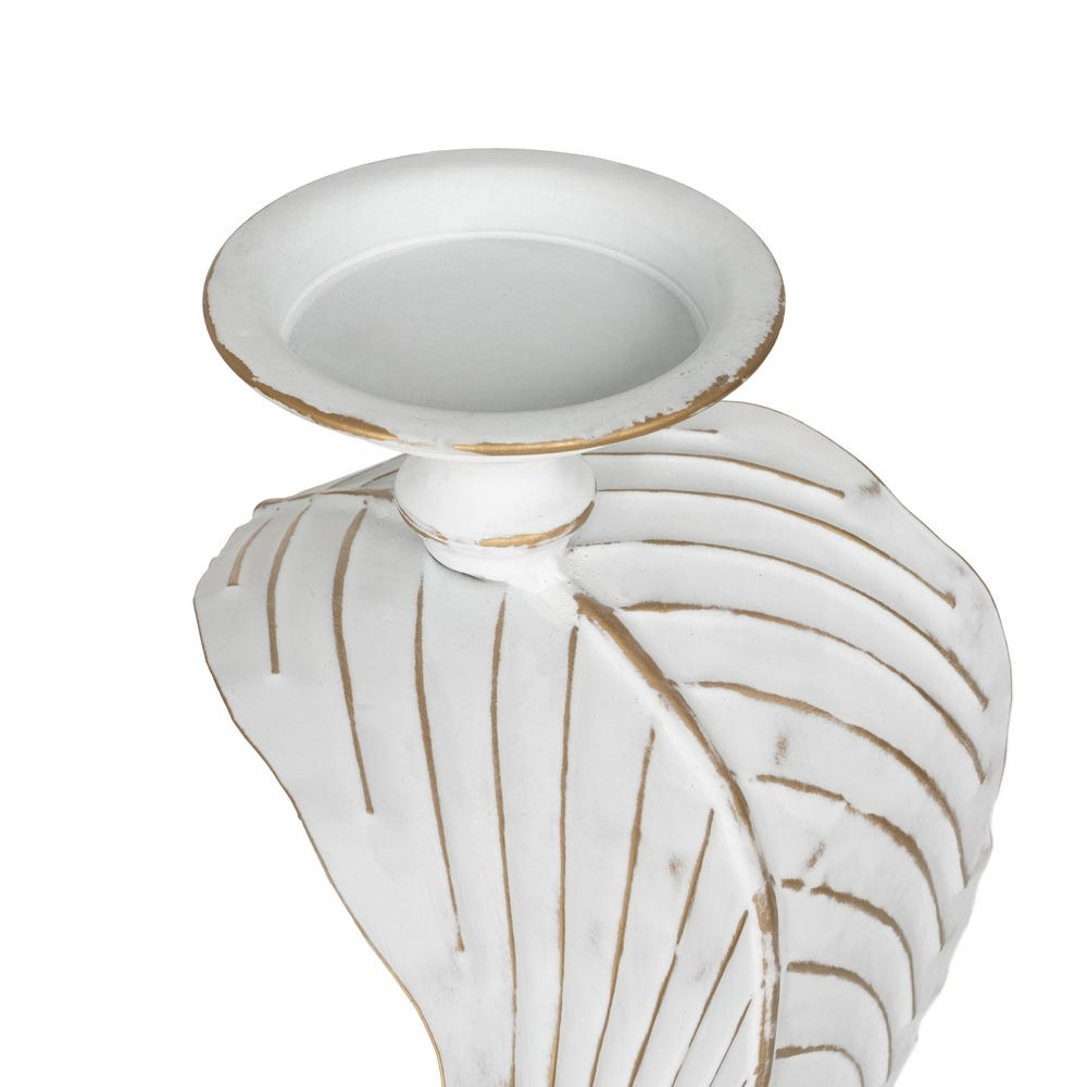 Piesa este susținută de o bază rotundă, iar tija verticală evidențiază frunza alungită, sculptată, cu linii fine care conturează modelul și oferă textură. Finisajul alb, cu accente ușor patinate, pune în valoare detaliile reliefate și oferă un aspect delicat, potrivit pentru decor modern, clasic sau romantic.
