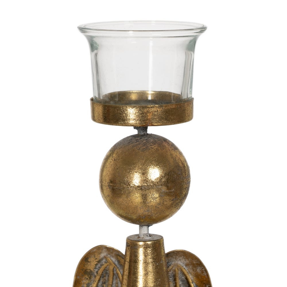Sus, suportul include un recipient din sticlă pentru lumânare, care pune flacăra în valoare și adaugă un detaliu luminos, discret și elegant. Datorită proporțiilor sale, se așază bine pe consolă, comodă sau pe masă, fie ca piesă centrală, fie ca parte dintr-un aranjament decorativ cu accente aurii.
