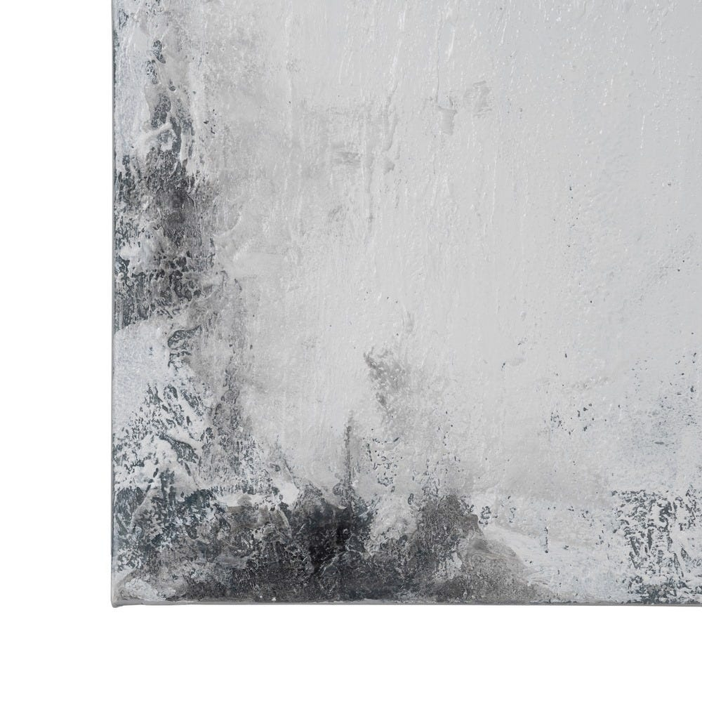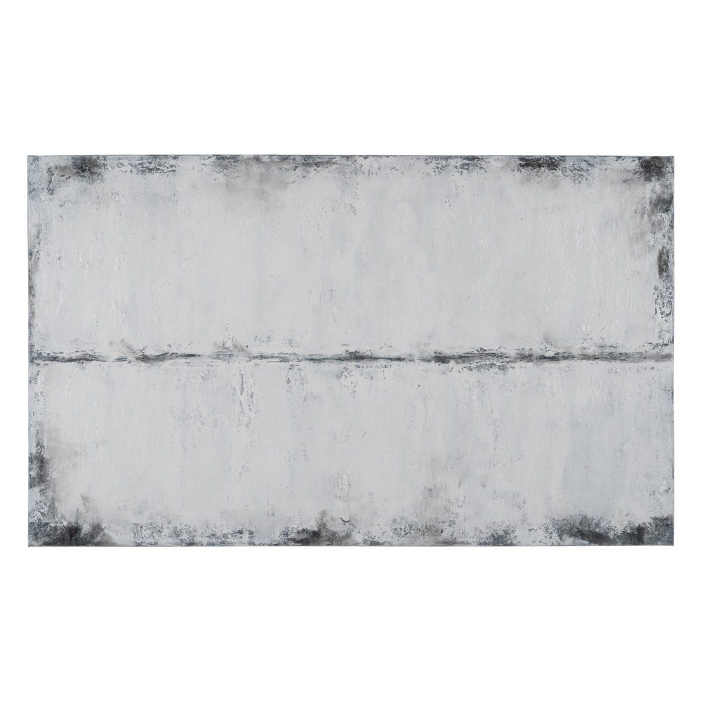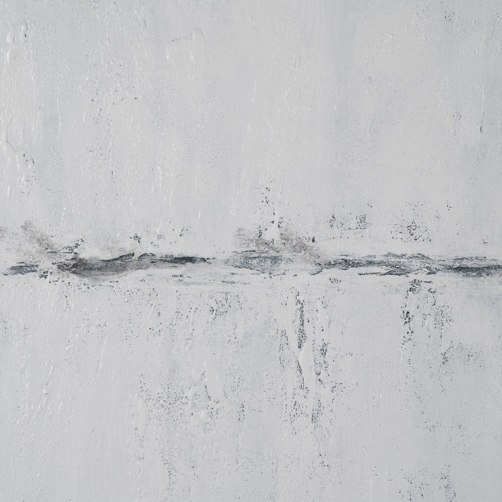 Acest tablou abstract de mari dimensiuni captează prin simplitatea aparentă și profunzimea compoziției. Linia orizontală subtilă care traversează centrul lucrării aduce un echilibru meditativ, sugerând orizontul unui peisaj stilizat sau granița dintre două stări de spirit. Textura este aplicată manual în tonuri de alb, gri și accente închise în colțuri, creând un efect de profunzime și mișcare liniară discretă.