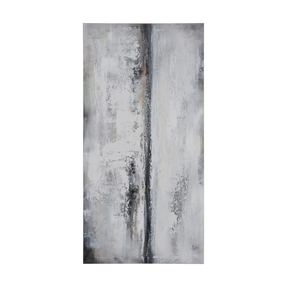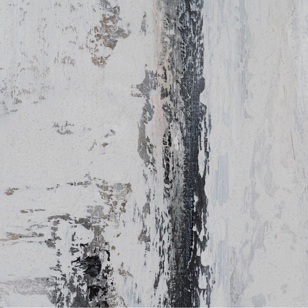 Un tablou abstract elegant, pictat integral manual, ce mizează pe subtilitate, echilibru și textură. Compoziția sa verticală se remarcă printr-un contrast discret de tonuri de gri, alb, negru și accente bej închise, care par să se desfășoare ca un peisaj vertical urban sau o reflecție pe o suprafață metalică.