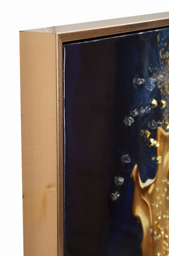 Tablou abstract albastru intens cu accente aurii, realizat pe pânză texturată cu efect tridimensional și montat pe cadru din lemn. Ideal pentru decoruri glam, moderne sau sofisticate.