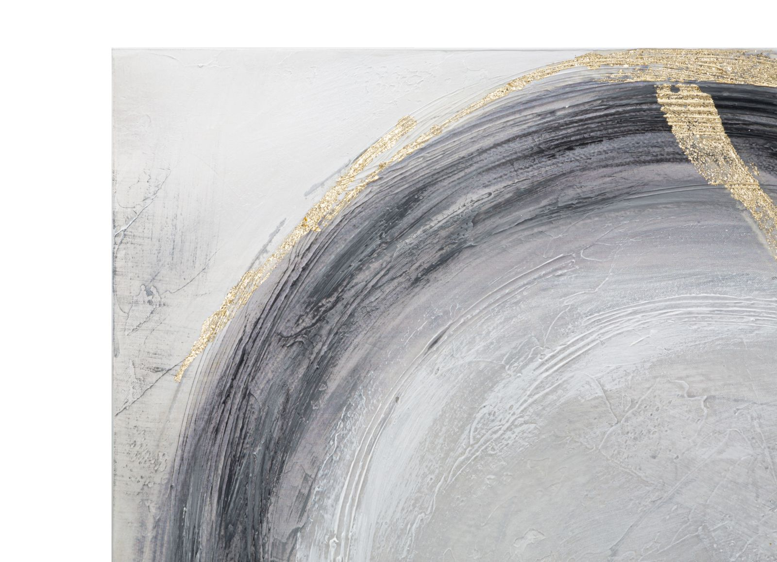 Un tablou decorativ impresionant prin dimensiune și rafinament, ideal pentru interioare sofisticate în care arta contemporană este o extensie a designului de lifestyle. Lucrarea explorează compoziții circulare de mari dimensiuni, pictate în tonuri subtile de gri perlat și cărbune, peste care se suprapun trasee spontane de auriu aplicat în textură – ca o dansantă mișcare de pensulă cu foiță metalică.