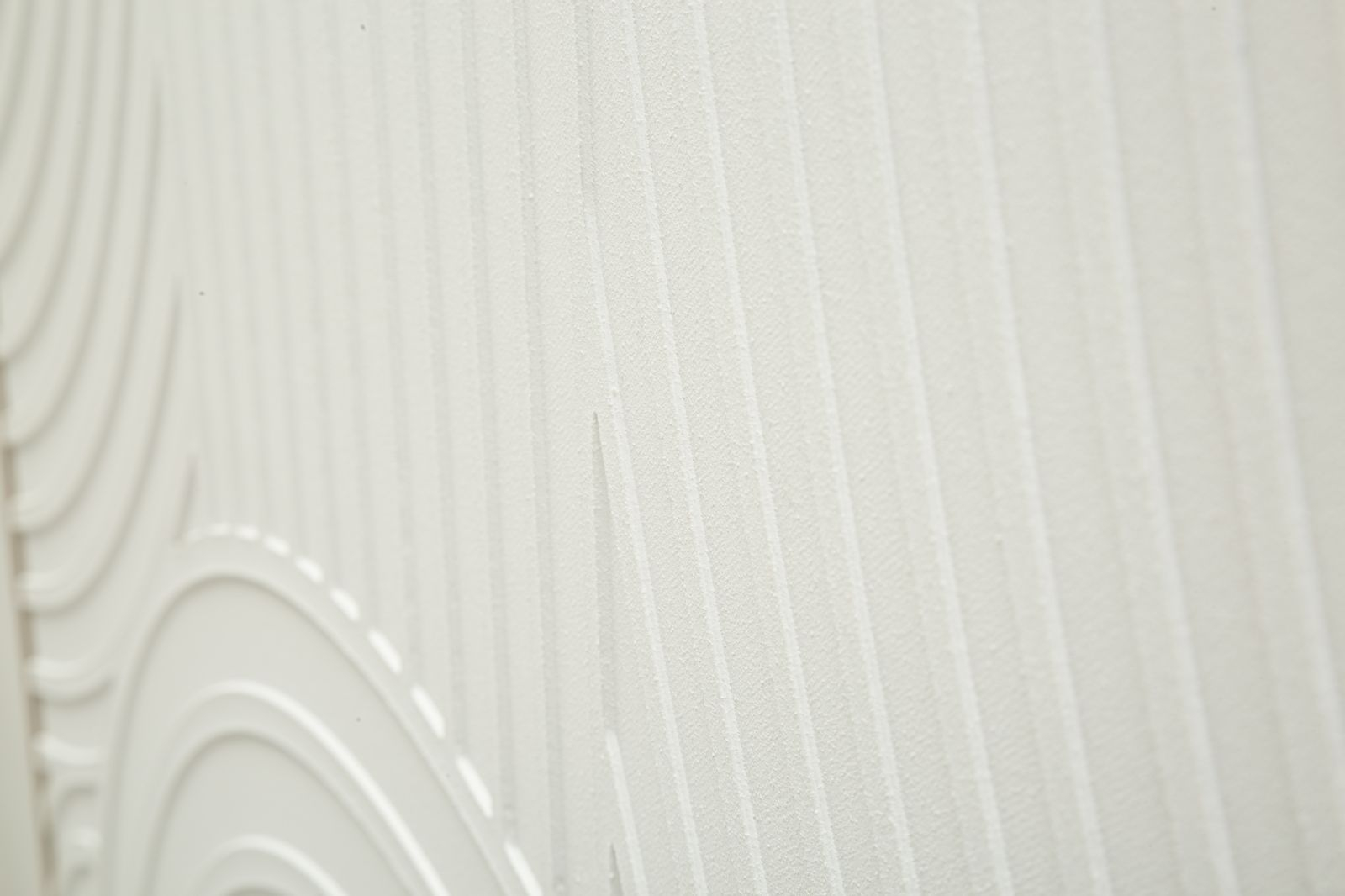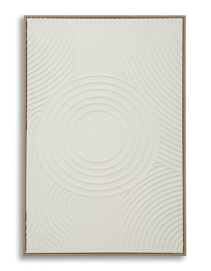 Compoziția monocromă în alb cald este structurată în jurul unor cercuri concentrice și linii curbe, dispuse simetric pe toată suprafața pânzei, creând un efect vizual de mișcare silențioasă și profunzime tactilă. Textura în relief adaugă un joc discret de lumină și umbră care schimbă percepția în funcție de unghiul de privire. Este o piesă care transmite calm, ordine și rafinament discret, fără a încărca spațiul.