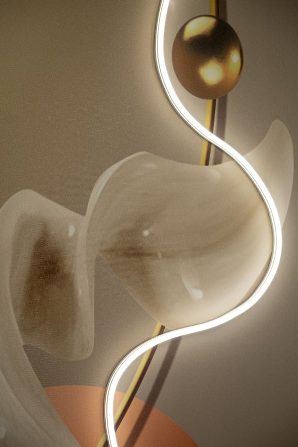Tabloul Canvas Abstract cu LED – varianta A – imbina armonios formele fluide cu elemente geometrice moderne, intr-o compozitie eleganta si echilibrata. Liniile curbe si accentele aurii sunt puse in valoare de iluminarea LED integrata, care adauga profunzime si un efect vizual sofisticat.