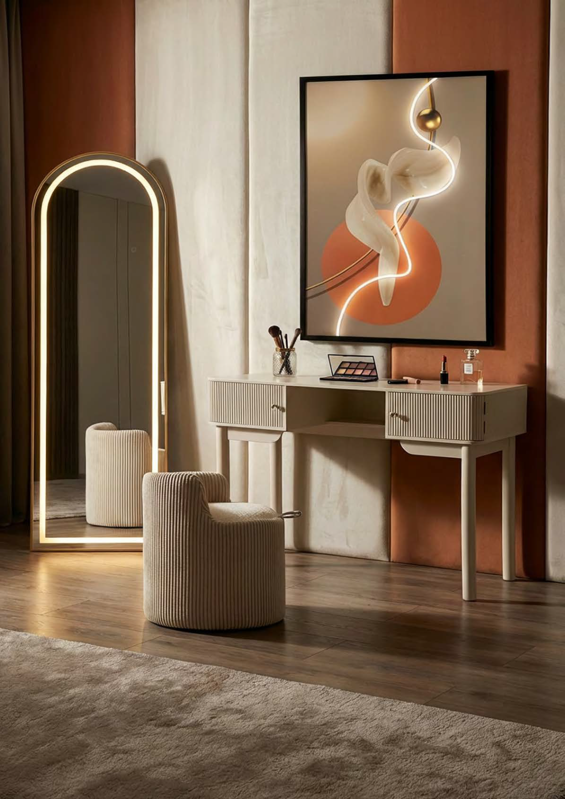 Paleta cromatica in tonuri calde si neutre, completata de detalii moderne, transforma tabloul intr-un element decorativ statement, potrivit pentru livinguri contemporane, birouri elegante sau spatii HoReCa cu design actual. Jocul dintre lumina si formele sinuoase creeaza dinamism si un aer rafinat.