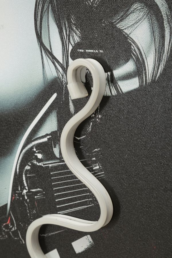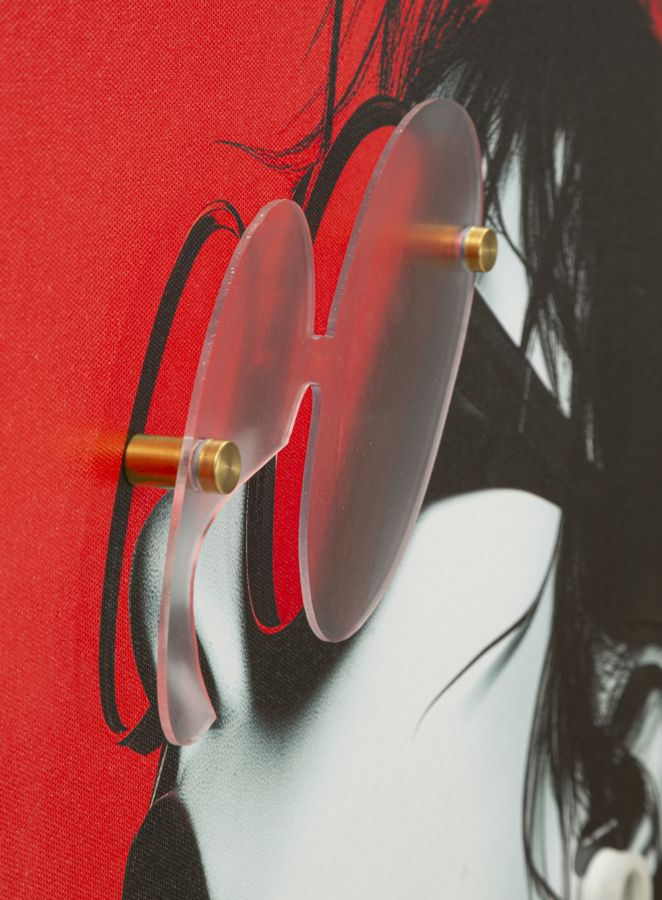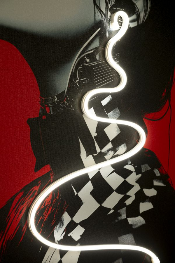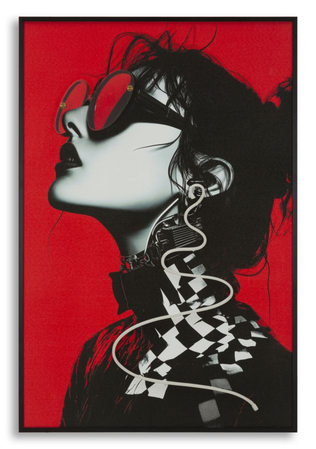Tabloul Canvas cu LED – varianta Psyco B – reda un portret feminin modern, cu atitudine puternica si influente urbane, evidentiata prin contrastul intens dintre rosu vibrant si tonurile de negru si alb. Stilul expresiv si detaliile grafice sunt completate de aplicatii 3D din acrilic si de iluminarea LED integrata, care traseaza linii de lumina si amplifica dinamismul compozitiei.