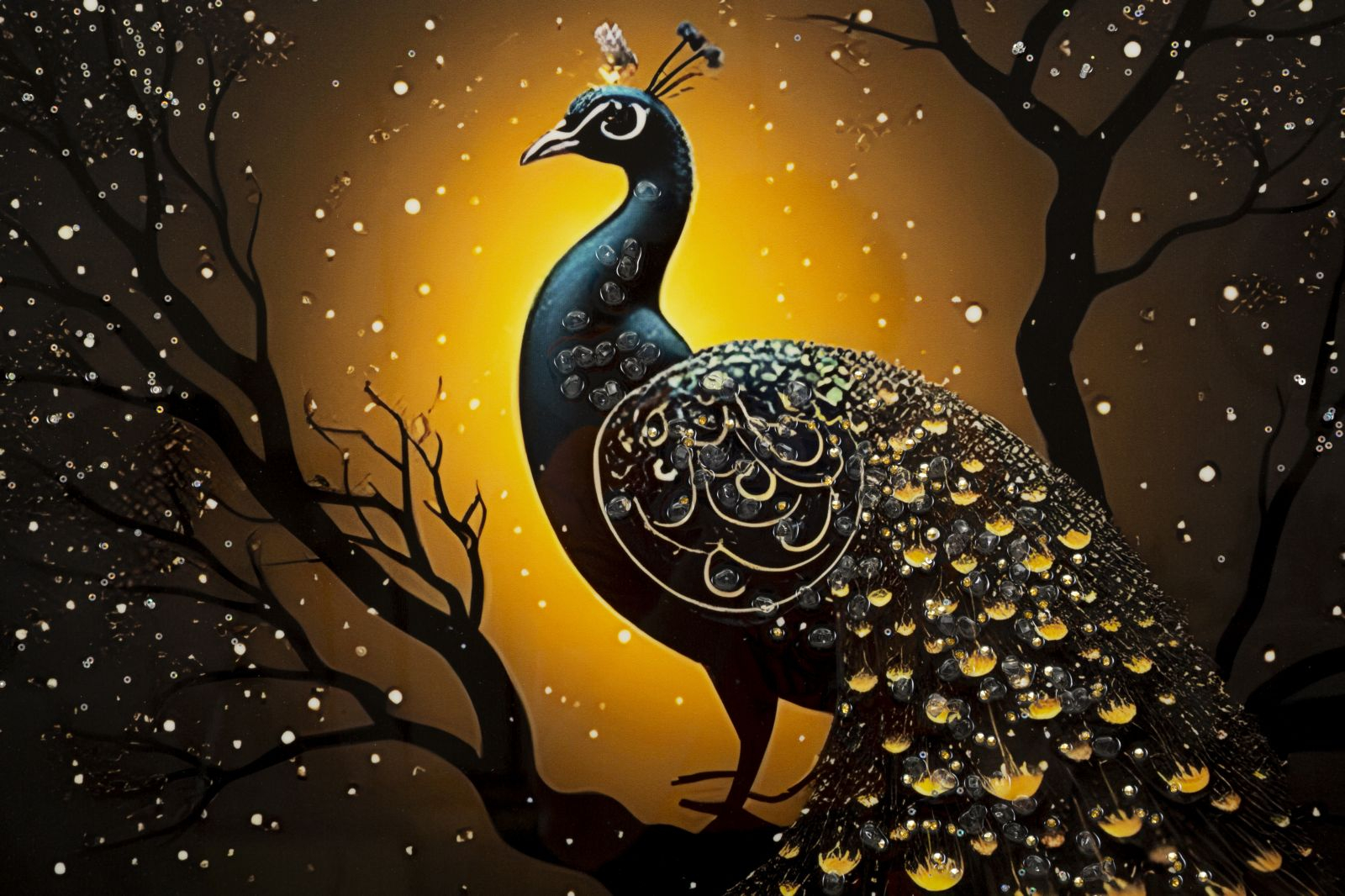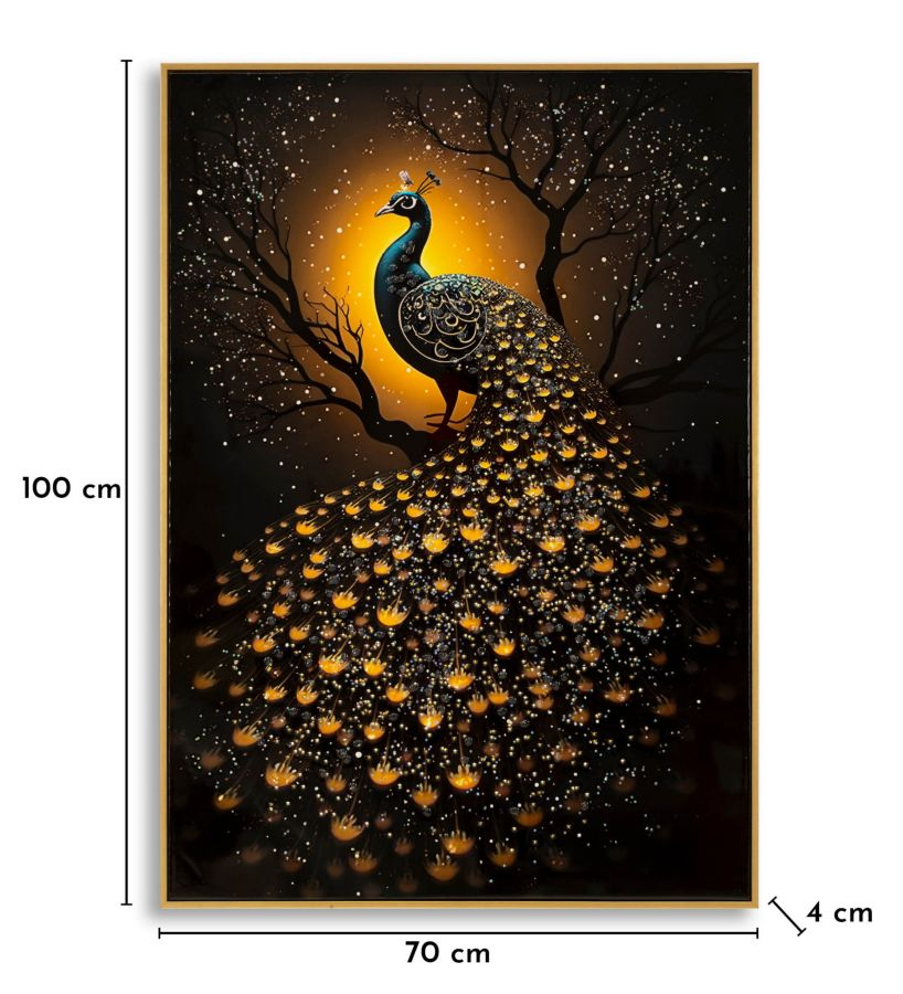 Tabloul Canvas Peacock Laquared surprinde un paun impunator, cu coada deschisa spectaculos sub un cer auriu, creand un joc fascinant de lumini si reflexii. Detaliile stralucitoare ale penajului si contrastul dintre fundalul inchis si halo-ul luminos din spate confera compozitiei un aer regal si misterios.