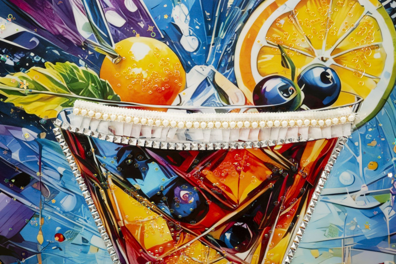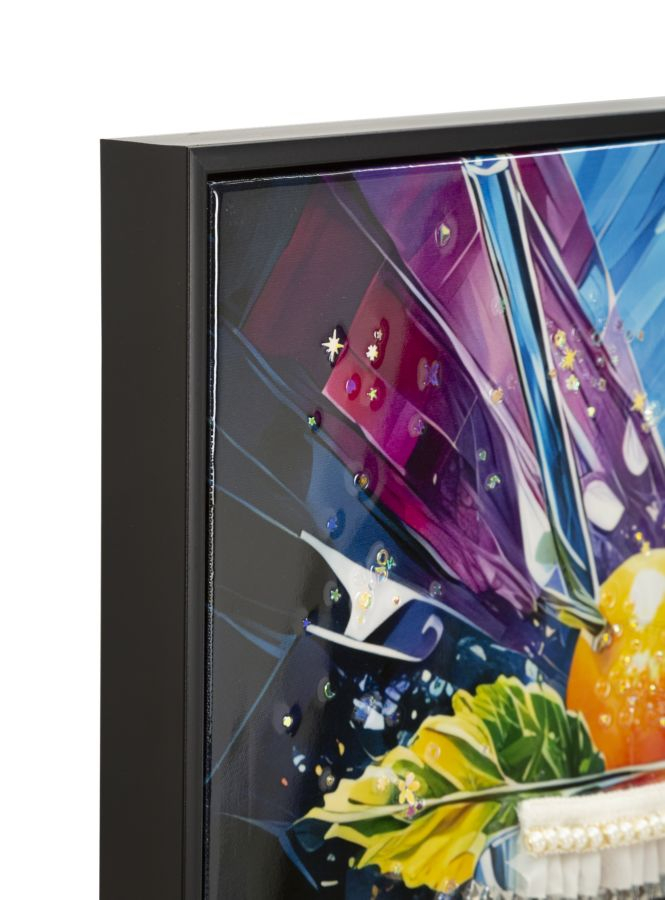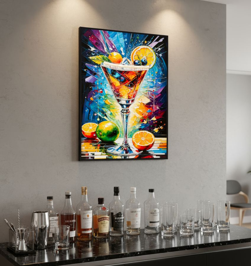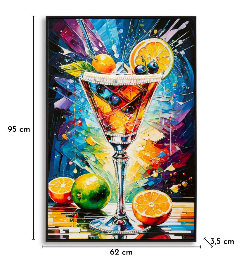 Tabloul Canvas Cocktail Laquared reda un pahar de cocktail vibrant, plin de culoare si dinamism, inconjurat de felii de citrice si accente grafice spectaculoase. Explozia de nuante intense – albastru, galben, portocaliu si rosu – creeaza un efect vizual energic, care transmite voie buna, prospetime si spirit contemporan.