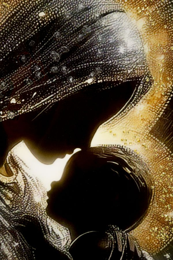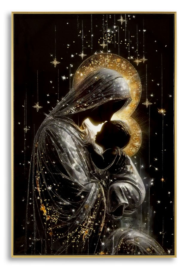 Tabloul Canvas Maternity Laquared reda o scena sensibila de maternitate, in care silueta mamei si a copilului este conturata de reflexii aurii si accente argintii stralucitoare. Aureola luminoasa din jurul capetelor si jocul delicat al stelutelor creeaza o atmosfera sacra, profunda si plina de emotie.