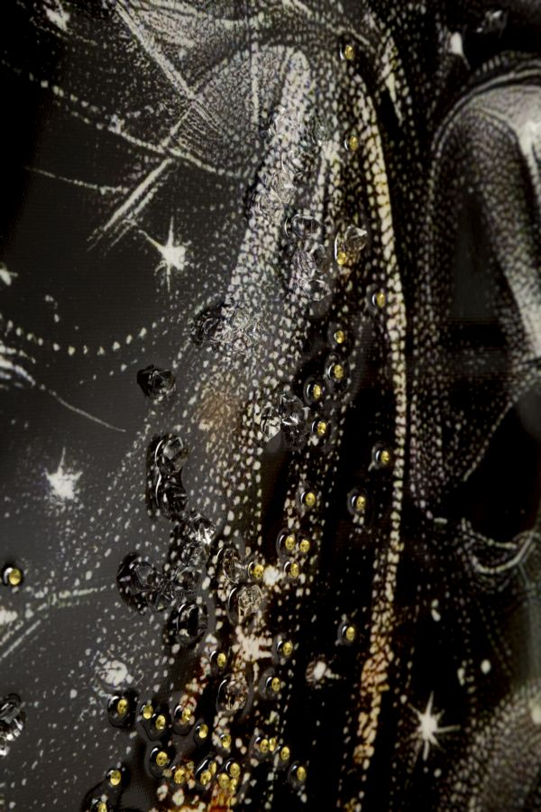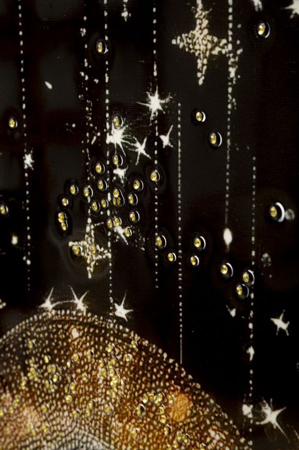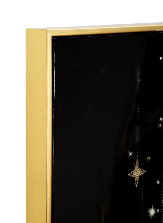 Contrastul dintre fundalul inchis si luminile metalice transforma acest tablou intr-o piesa statement eleganta, cu un puternic impact vizual si simbolic. Este ideal pentru dormitoare, livinguri rafinate sau camere de copii, dar si pentru spatii HoReCa precum hoteluri boutique, clinici private sau zone de relaxare unde se doreste transmiterea unei atmosfere calde, protectoare si pline de spiritualitate.