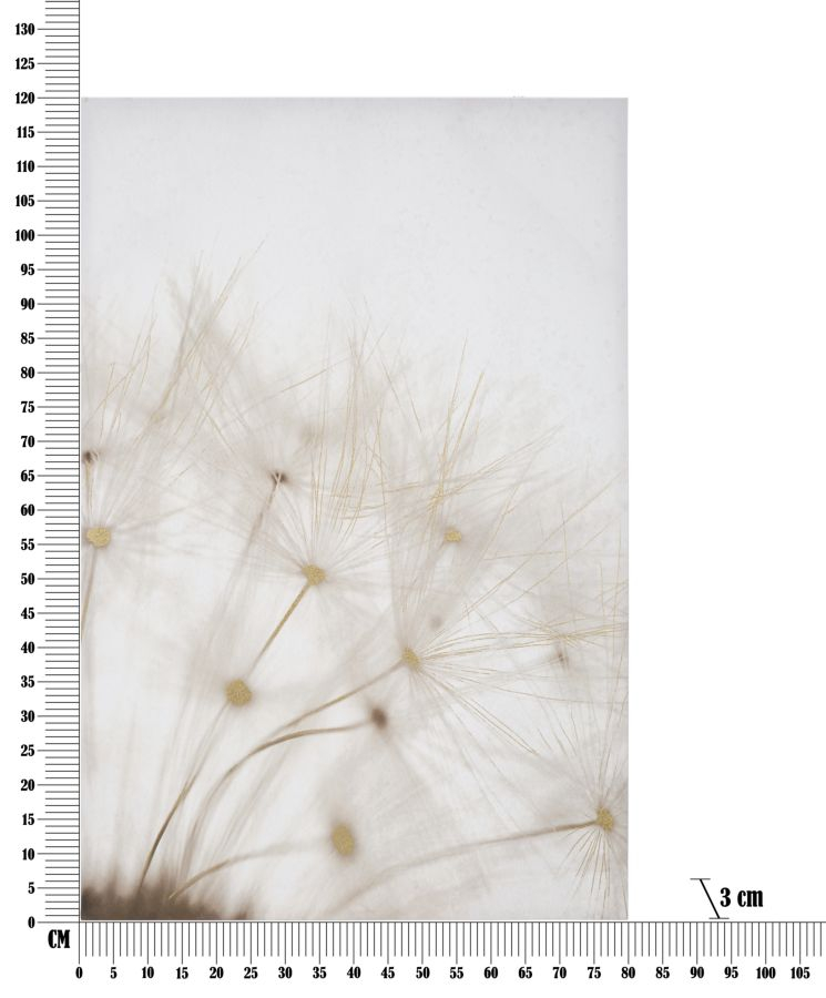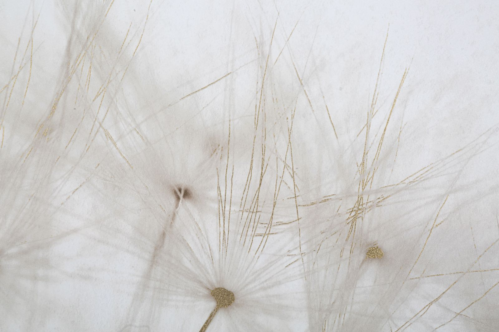 Imaginea este o captură macro a unei păpădii mature, surprinsă în cele mai fine detalii ale semințelor sale – tije subțiri, aproape transparente, și puncte aurii discrete ce adaugă o notă caldă și poetică. Tonurile neutre de alb, bej deschis și accentele subtile de galben pastelat creează un efect de calm vizual, aproape meditativ. Tabloul aduce un aer de visare, simplitate și frumusețe naturală, fiind perfect pentru spații unde natura este sursă de inspirație.