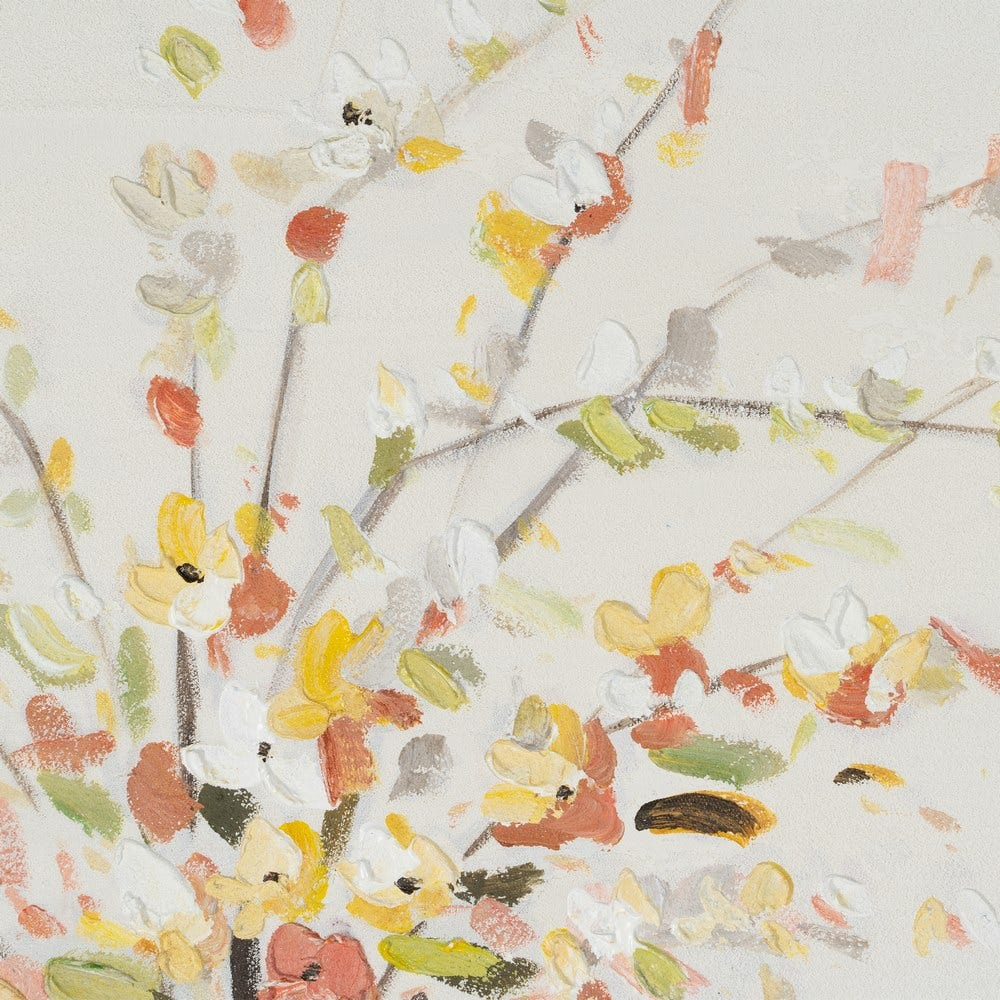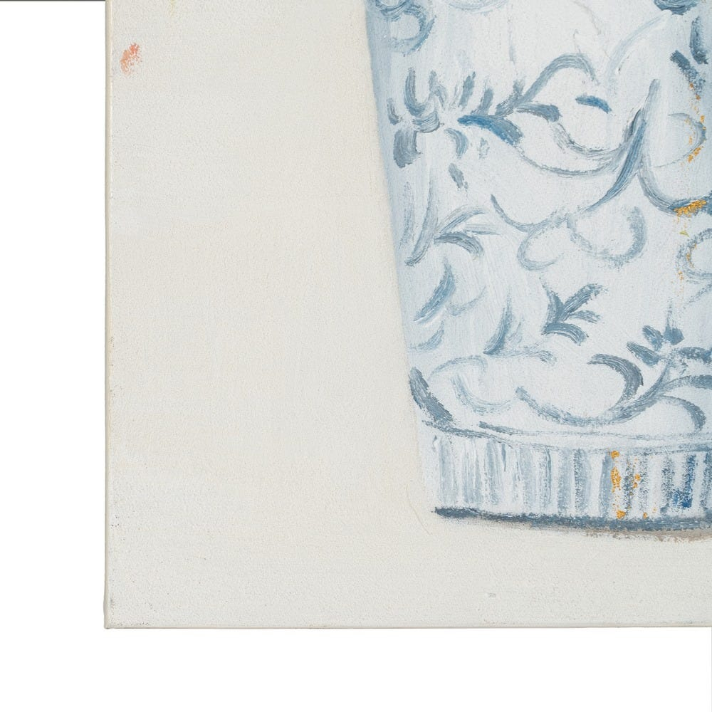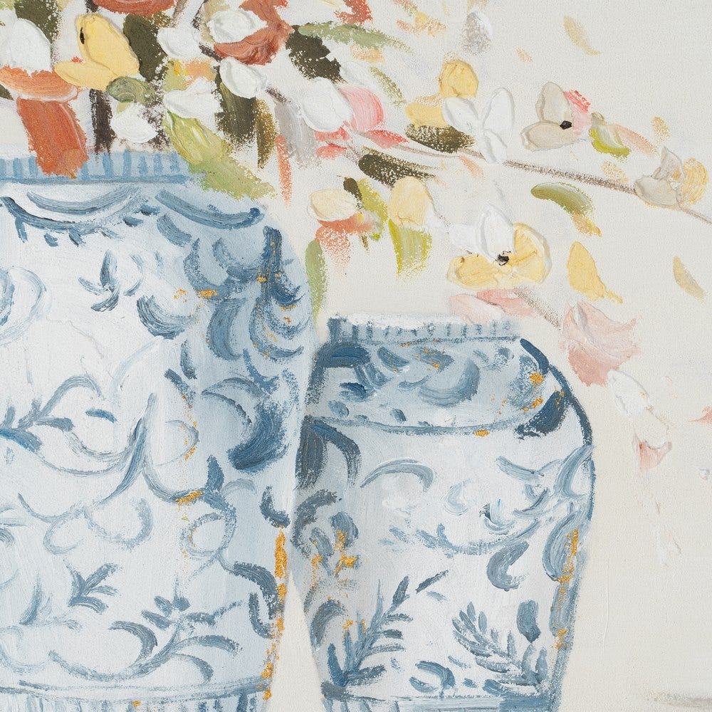 Acest tablou pictat manual aduce în decor o compoziție florală simplă și luminoasă, cu două vaze albastre decorate discret și un buchet stilizat redat în tonuri calde, pastelate. Fiecare element floral este realizat cu tușe vizibile, oferind un efect tactil subtil și o textură plăcută ochiului. Fundalul crem deschis oferă contrast vizual echilibrat, punând în valoare florile fără a supraîncărca spațiul.