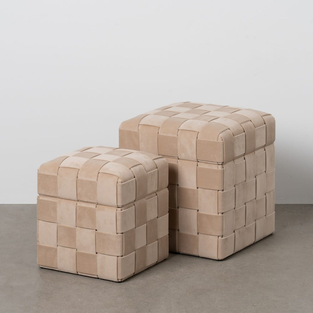 Set de 2 pufuri cu ladă bej din material textil plăcut la atingere, cu structură din MDF rezistentă, pentru depozitare discretă și șezut confortabil în living, dormitor sau hol.
