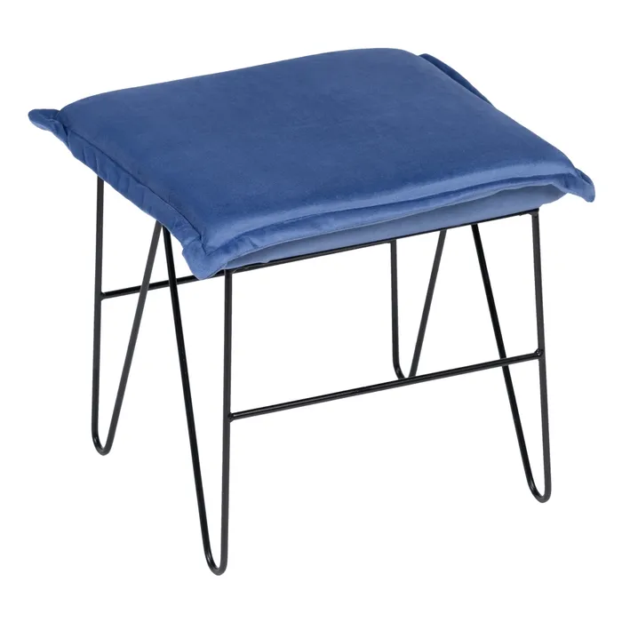 Acest taburet metalic cu șezut din catifea albastra este extrem de versatil și poate fi folosit în multiple moduri. Poziționează-l în living ca scaun suplimentar pentru oaspeți sau ca suport pentru picioare. În dormitor, poate servi ca taburet pentru toaletă sau ca scaun decorativ. De asemenea, este ideal pentru holuri, oferind un loc confortabil pentru a te încălța sau a-ți lăsa geanta.