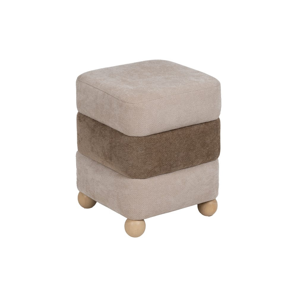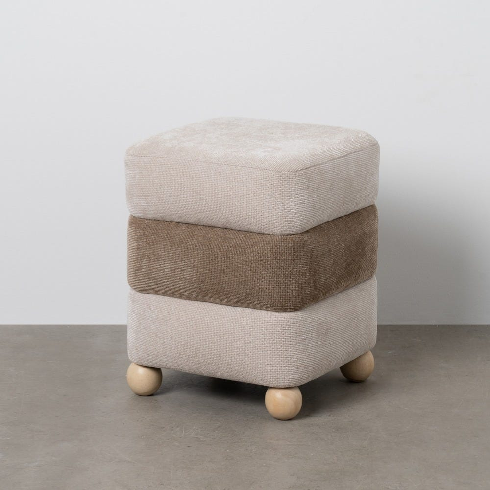 Taburetele patrate cu design stratificat si accente naturale sunt piese perfecte pentru decoruri moderne, jucause si armonioase. Acest model in nuante alternante de bej si maro, cu baza din lemn si forme rotunjite, adauga un aer creativ si cald in dormitor, hol sau living.