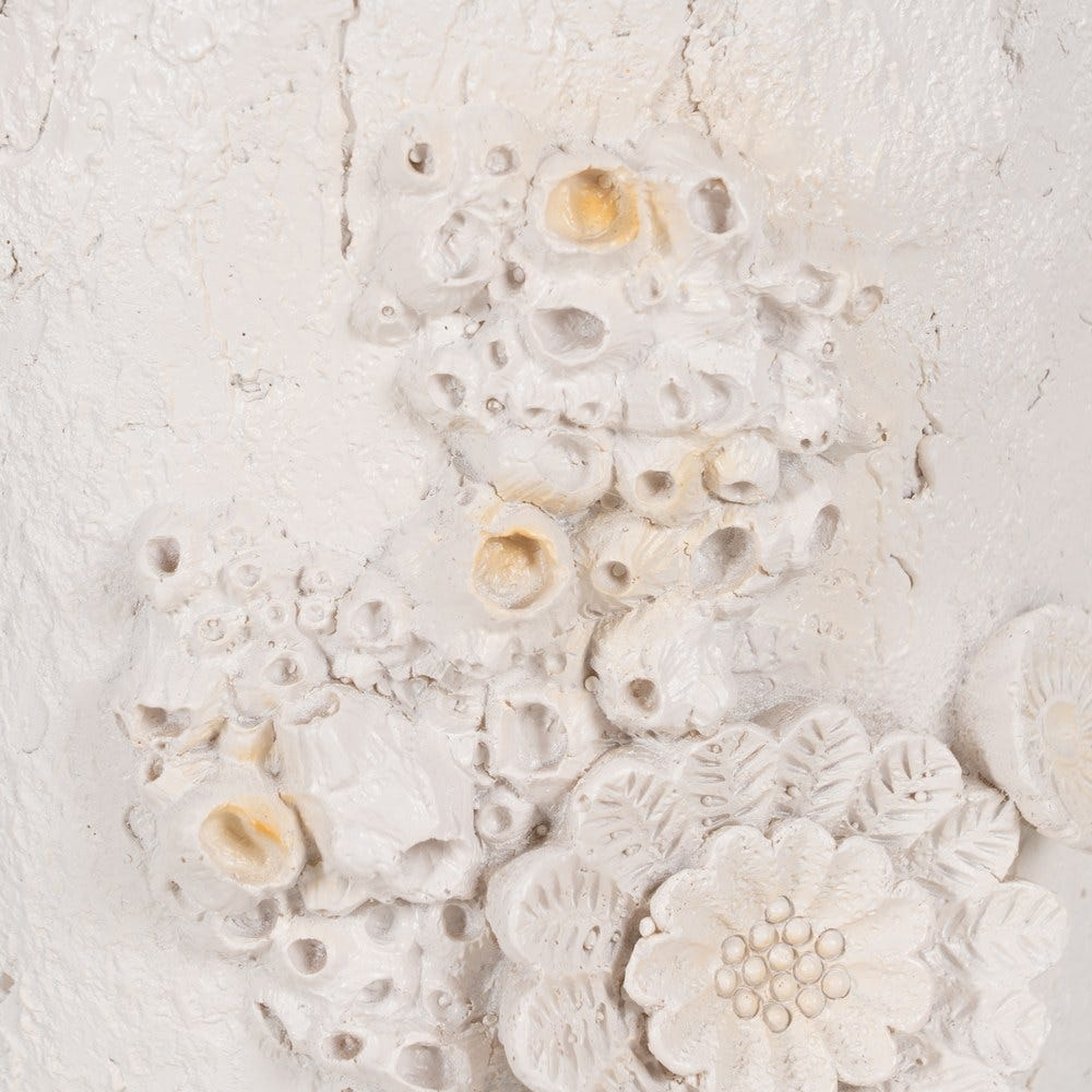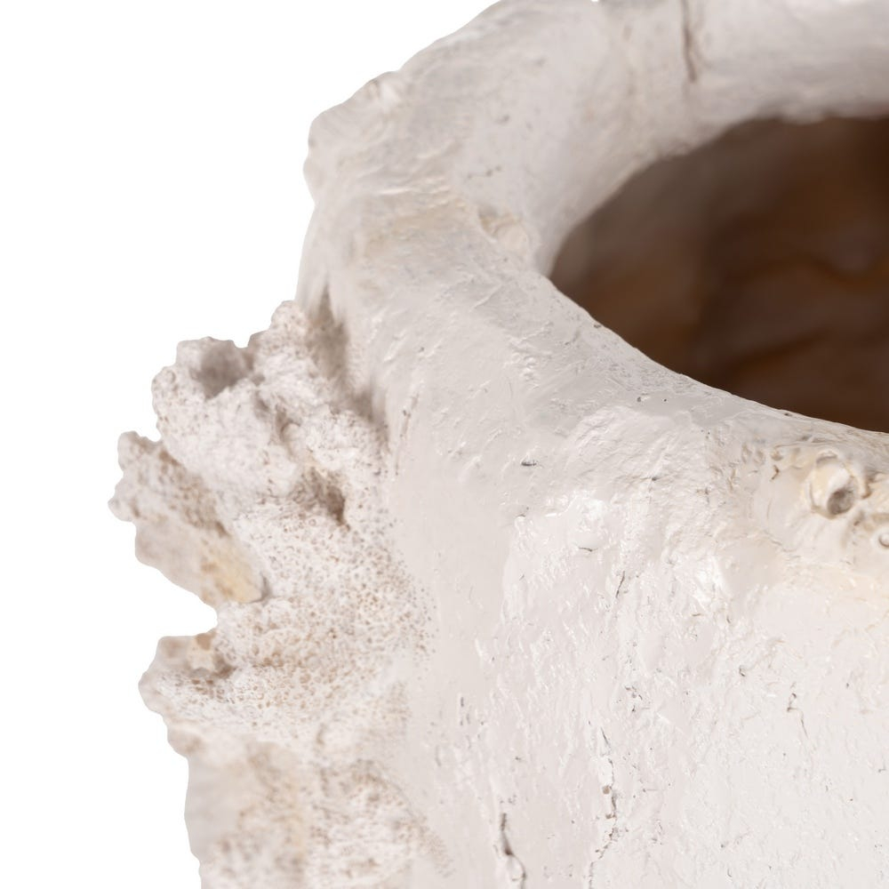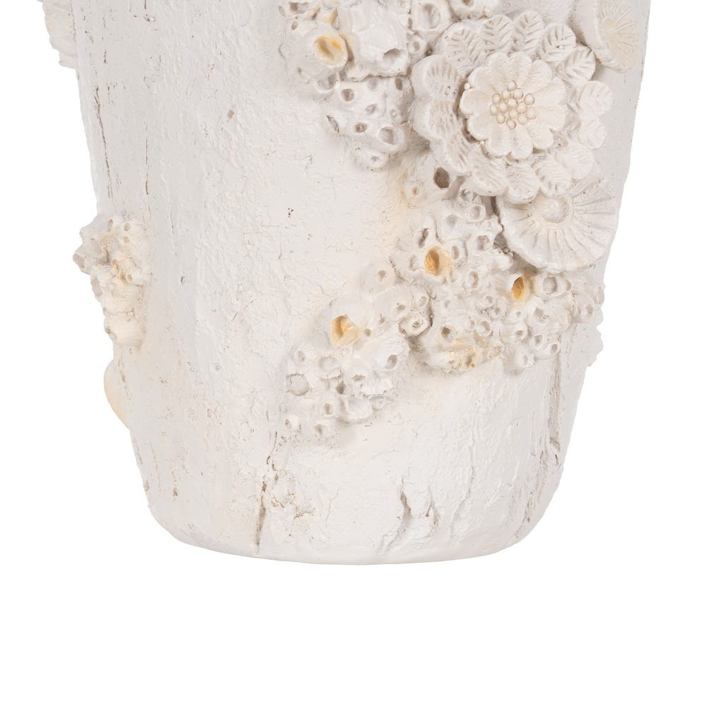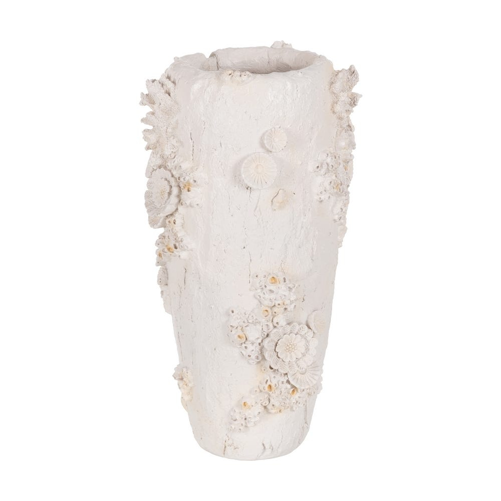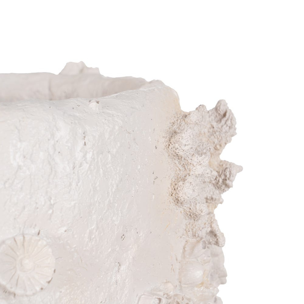 Suprafața vazei este decorată cu elemente inspirate din forme marine, evidențiate prin detalii reliefate care adaugă profunzime și un aspect decorativ aparte. Nuanța albă contribuie la un decor luminos și echilibrat.