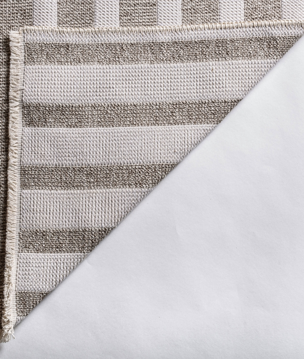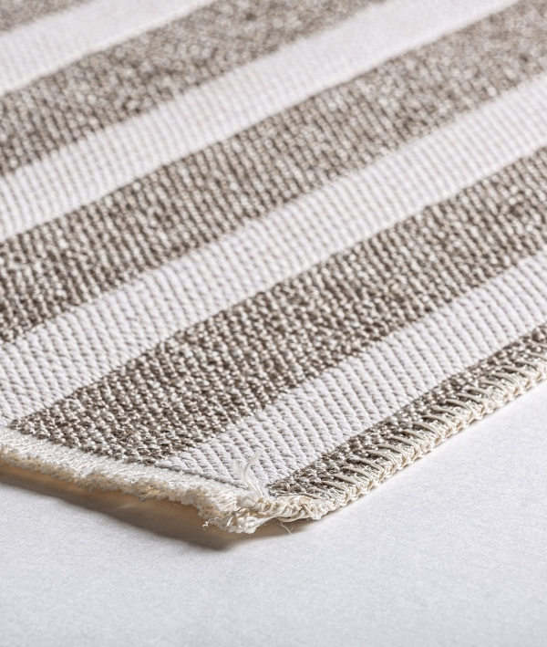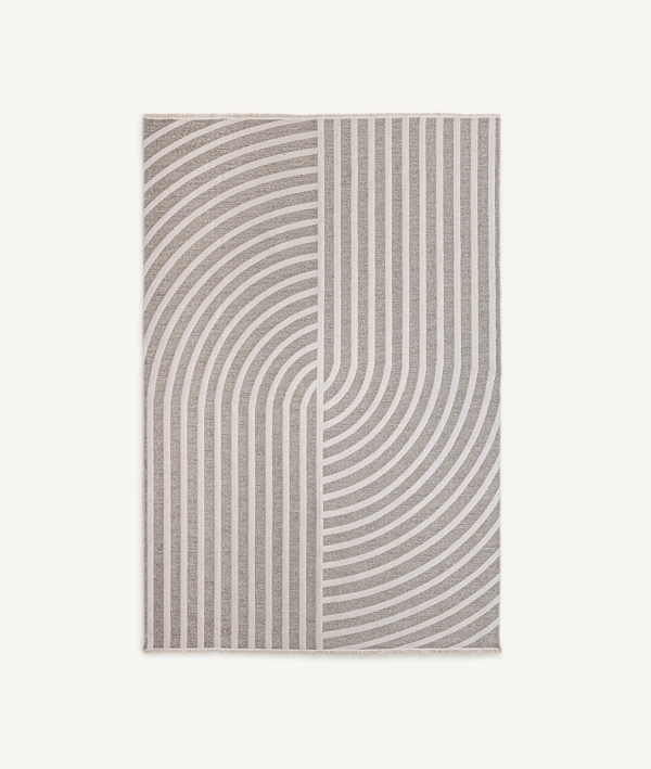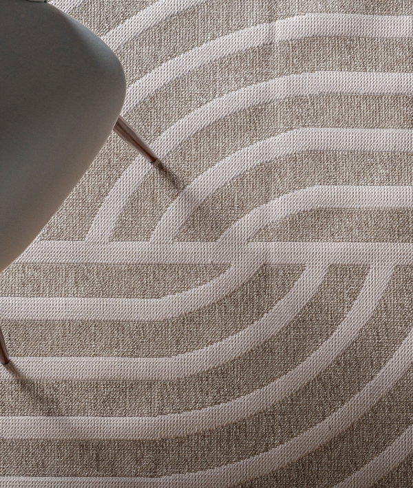 Covor modern YOLANDA cu design geometric curbat – o piesă decorativă versatilă, realizată în nuanțe neutre de maro și crem, ce adaugă stil și confort oricărui spațiu contemporan.