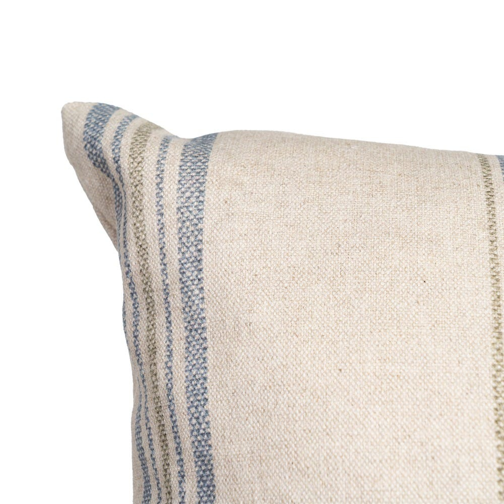 Suprafața pernelor este decorată cu dungi verticale dispuse regulat, alternând tonuri de albastru și gri pe un fundal crem deschis. Modelul liniar conferă un aspect clar și bine definit, ușor de integrat într-un decor cu influențe clasice sau naturale.