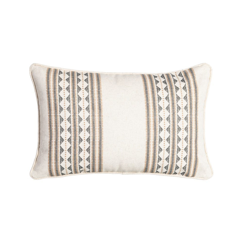 Setul de 2 perne decorative dreptunghiulare adaugă un accent grafic și echilibrat în amenajarea livingului sau a dormitorului. Modelul decorativ amplasat lateral, cu motive geometrice repetate în nuanțe de gri și bej pe fundal crem, creează un contrast discret și plăcut. Realizate din 85% bumbac și 15% in, cu umplutură din poliester, aceste perne decorative completează armonios zona de relaxare.