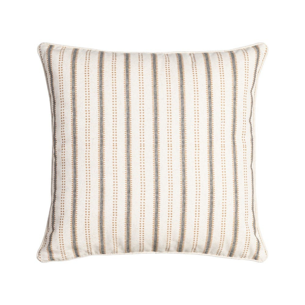 Setul de 2 perne decorative pătrate aduce un accent discret și echilibrat în amenajarea livingului sau a dormitorului. Imprimeul cu dungi verticale alternate, formate din linii și șiruri punctate în nuanțe de gri și bej pe fundal crem, creează un efect vizual ritmat și armonios. Realizate din 85% bumbac și 15% in, cu umplutură din poliester, aceste perne decorative completează zona de relaxare prin textură și detaliu decorativ.