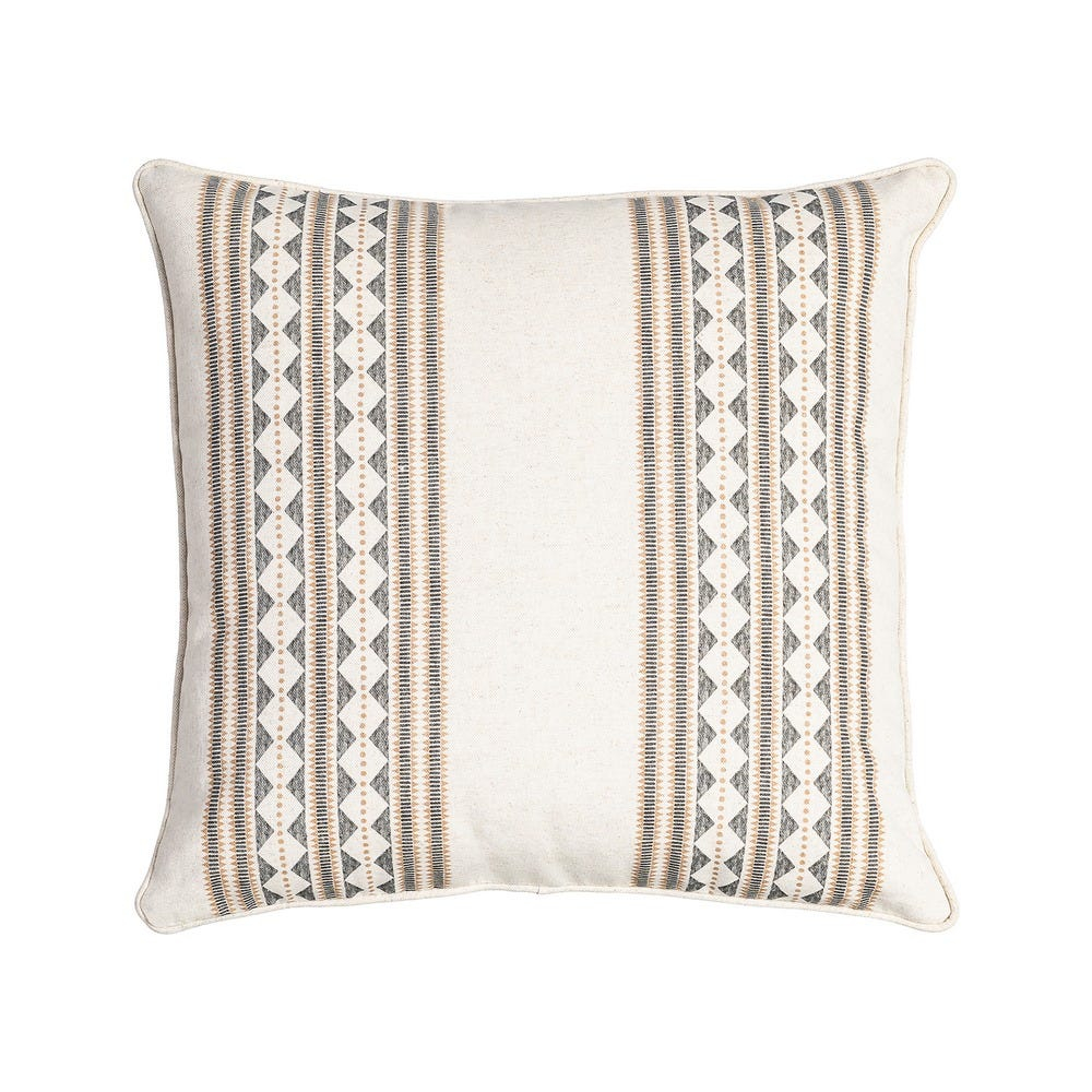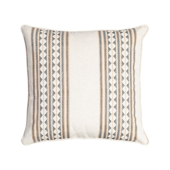 Setul de 2 perne decorative pătrate aduce un accent grafic și echilibrat în amenajarea livingului sau a dormitorului. Modelul decorativ poziționat lateral, cu motive geometrice repetate în nuanțe de gri și bej pe fundal crem, creează un contrast discret și plăcut. Realizate din 85% bumbac și 15% in, cu umplutură din poliester, aceste perne decorative completează armonios zona de relaxare.