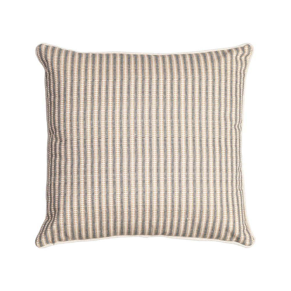 Suprafața pernelor este evidențiată prin benzi decorative verticale amplasate pe laterale, formate din elemente geometrice dispuse ritmic. Zona centrală rămâne într-o nuanță crem simplă, accentuând contrastul dintre fond și model.